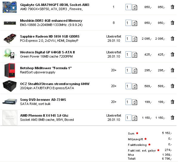 bad__ip Skrevet 26. januar 2010 Skrevet 26. januar 2010 Det at dere kan sakene deres det ser jeg, så skal ikke klage, kjekt å lære. Har liksom aldri satt opp noen billige systemer før, pleier å ligge rundt 10 000 kroner, da har man plutselig litt mer å rutte med. Systemet til sovehest er kjempe, men de har ikke så billige kabinett på komplett. Vis det er av interesse så kunne jeg skaffet dette: AMD II 955 1175,- ASUS 790X 837,- Chieftec SS 650W 612,- OCZ Gold 4GB 1333MHz 789,- CoolerMaster Elite 310 307,- Samsung SH-S223C 179,- Samsung F3 500GB 380,- Sapphire HD5850 2095,- Sum er da kr 6374,- Fornøyd med det da, eller er det fortsatt noe å klage på?