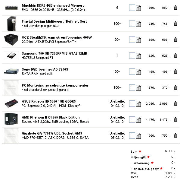 ttoz Skrevet 2. februar 2010 Forfatter Skrevet 2. februar 2010 Vel.. jeg kan vel øke budsjettet med en tusenlapp når jeg tenker meg om. Men det hadde vært veldig greit om noen kunne gi meg komponenter i netshop, og ikke i komplett, det hadde vært fryktelig til hjelp