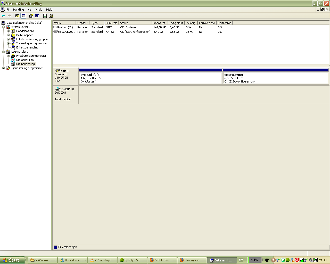 osse-mon waits for alice Skrevet 18. februar 2010 Skrevet 18. februar 2010 Det ser ut til at du har To partisjoner (deler) på disken. Den ene har gjenopretningsfiler, den andre har Alt det andre. Den disken som heter "preload" står det er på 142GB. Har du kjørt TreeSize? Melder den i fra om noen enorme mapper?