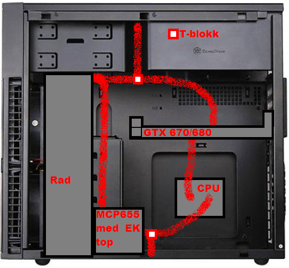 MiiX Skrevet 16. mai 2012 Skrevet 16. mai 2012 Du bør koble vanntilførselen rett til pumpa, så slipper du å ødelegge pumpa. Ut fra bildet så virker det som at pumpa får vannet fra raddisen. Kan jo gjøre dette; Rad -> T-blokk -> 90*-blokk -> komp.nippel -> slange ned til pumpe.