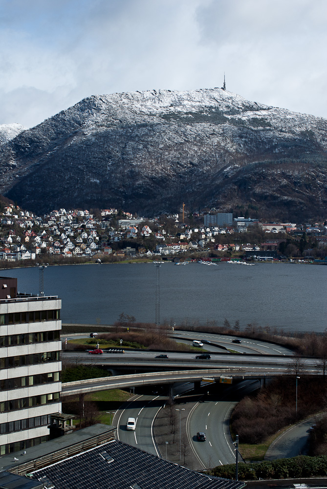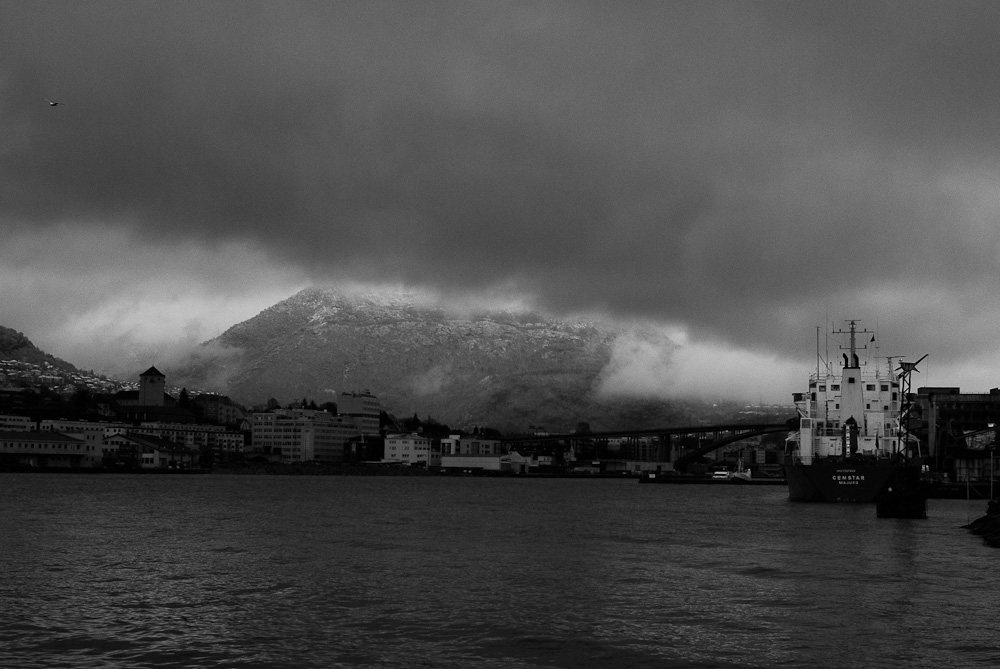 Grått i Bergen i formiddag. Snødde faktisk litt rett før eg gjekk ut.