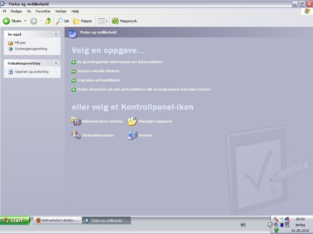 Fryvil Skrevet 1. mai 2010 Forfatter Skrevet 1. mai 2010 Du kan prøve dette, går ut ifra du bruker windows. Åpne Enhetsbehandling ved å klikke Start-knappen , Kontrollpanel, System og vedlikehold og deretter Enhetsbehandling. Finn nettverkskort, høyreklikk og velg egenskaper> strømstyring. Kryss ut "Tillat datamaskinen å slå av denne enheten for å spare strøm". Sorry, men jeg finner ikke enhetsbehandling Prøvde å legge ved Print screen bilde av hva jeg ser inne på system og vedlikehold Uten navn.bmp