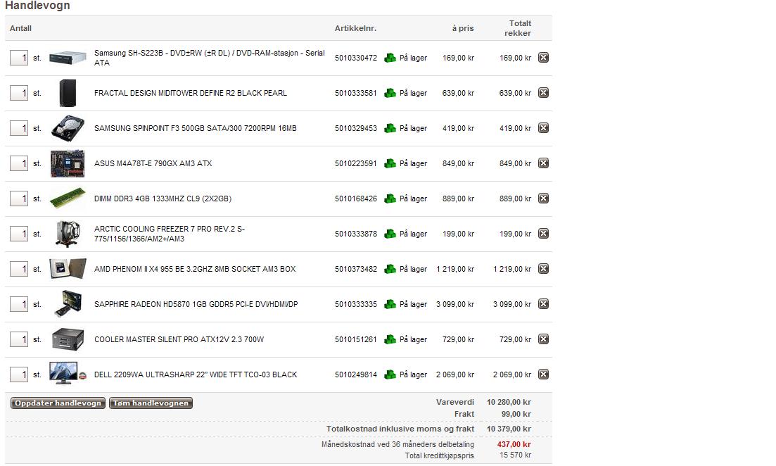 magb Skrevet 15. mai 2010 Skrevet 15. mai 2010 (endret) Den er sikkert fin til diverse redigering osv, men til gaming er oppsettet totalt feilprioritert. En gaming pc til 12000kr bør inneholde et Radeon 5870 eller 5970 kort. Ved å omprioritere litt, kan du få dobbel gaming ytelse til samme pris. Høres ikke det fint ut? For å ordne kapital til dette kan du gjøre følgende: - Kjøpe fra en billigere butikk en komplett, feks dustin home. - Bytte kabinett, feks Fractal design r2, Antec p180 mini, diverse cooler master eller liknende. - Gå for et am3 oppsett som er rimeligere og leverer nøyaktig samme gaming ytelse som ditt cpu oppsett fra komplett. Eks på oppsett som gir rundt dobbel fps i de fleste spill. Jeg la til en rimelig cpu kjøler for lavere støynivå og mulighet til å klokke litt. la også til en skjerm med Ips panel som har fått veldig god kritikk. Vil du spare noen kroner så har Dustin andre relativt gode skjermer til lavere pris. Feks Samsung skjermen du brukte i ditt oppsett eller en benq 24" led. Endret 15. mai 2010 av magb