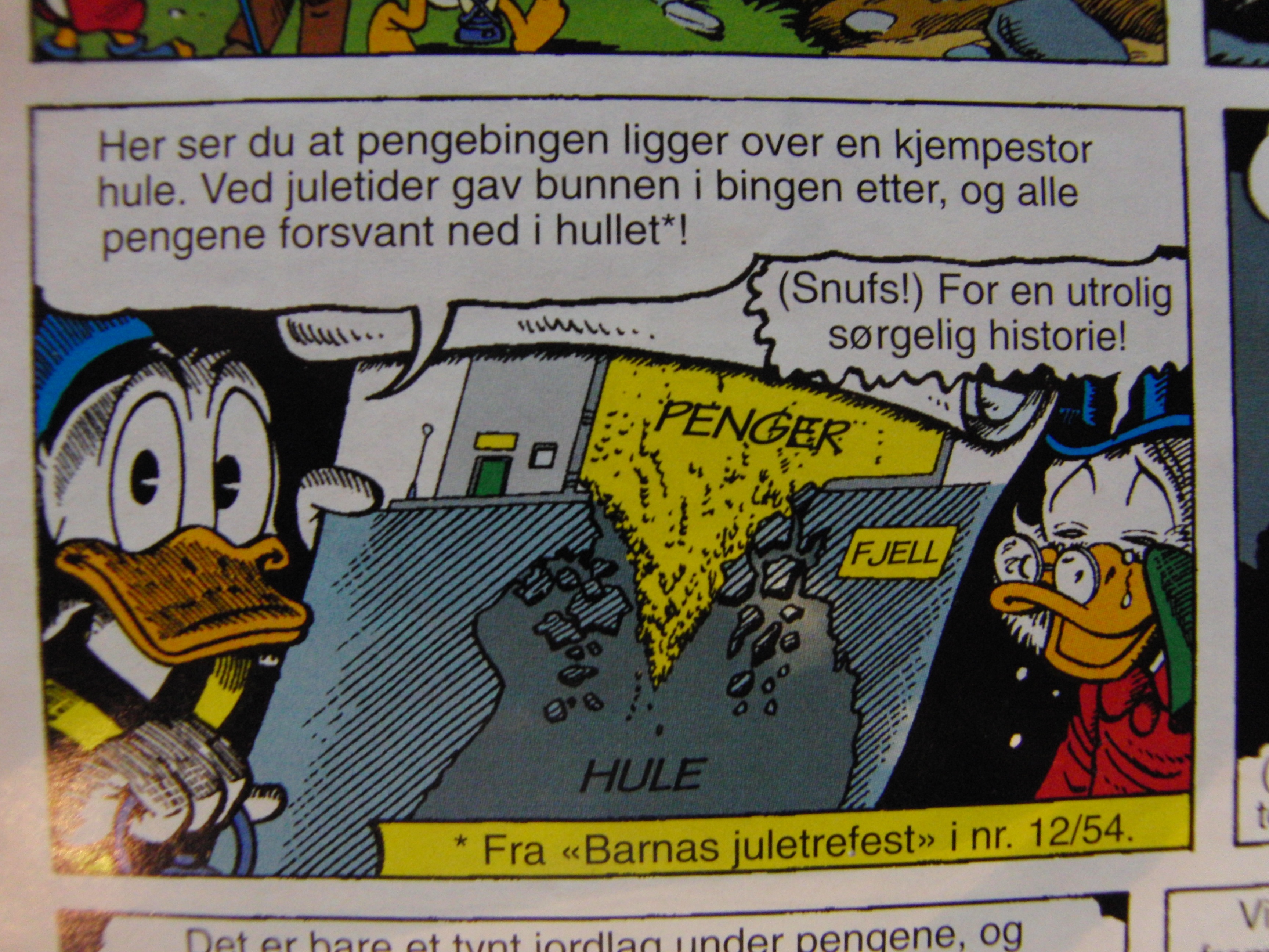 Del1 Skrevet 23. mai 2010 Skrevet 23. mai 2010 (endret) Jeg leter etter en gammel historie. Mener det er Carl Barks som har laget den. Den handler om at Onkel Skrue slipper en mynt i pengebingen sin, som blir for tung. Og bakken brister og han mister all formuen sin. Ole, Dole og Doffen har fått et leketog til Jul og finner pengene i en hule og kjører pengene ut igjen med leketoget Den er vel fra ca 50-tallet. Noen som husker tittelen på denne? Endret 23. mai 2010 av Del1