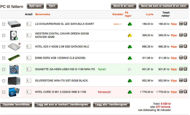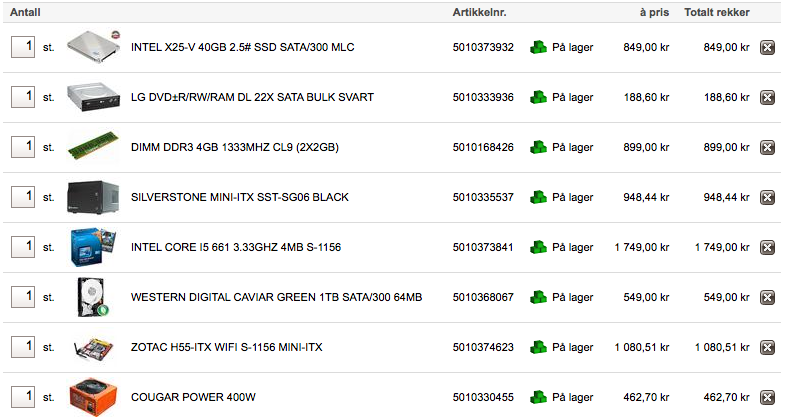Gjest Slettet+7412534 Skrevet 9. juni 2010 Skrevet 9. juni 2010 Tusen takk for svar. Har et forslag selv til ca 6000 kroner. Noen som funker eller ville dere valgt andre komponenter? Jeg valgte den prosessoren fra Intel da den har integrert grafikk som man trengte sammen med valgt hovedkort. Fant dessverre ikke ut hvordan jeg kunne lage en link av handlevognen så tok en print-screen. PS: Kommer nok til å kjøpe på Dustin Home da jeg som student får god pris + gratis frakt, med mindre noen andre butikker er betraktelig billigere.
