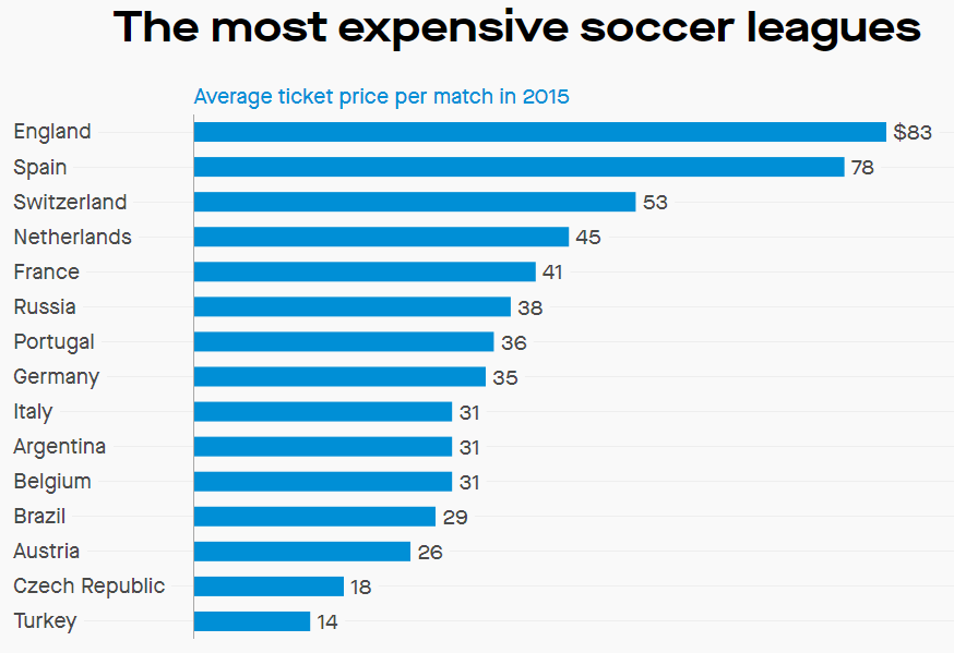 Her er også dessverre litt gamle tall fra 2015 hentet herfra, men illustrerer også kostnadene for å se PL. Du kan også se på hvordan spillerlønningene og kostnaden for å hente spillere har økt i samme periode. Samtidig blir stadig flere klubber dyrt leketøy for de ultrarike med god støtte fra "fansen".