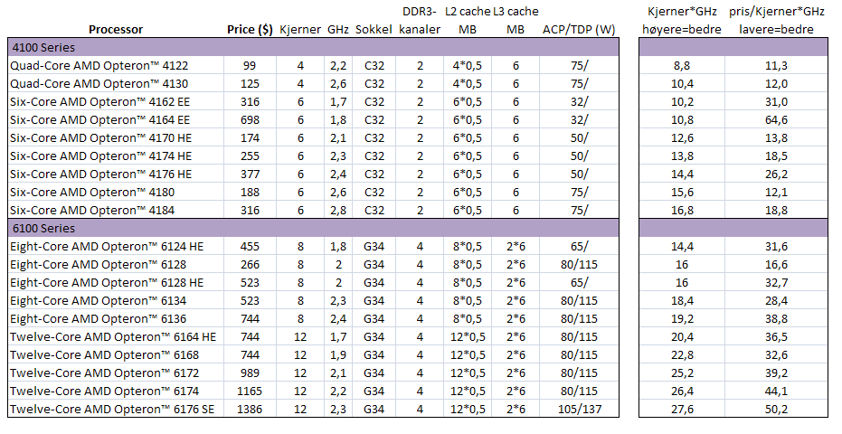 Simen1 Skrevet 23. juni 2010 Skrevet 23. juni 2010 Den største delen av denne nyheten er egentlig C32 brikkesettet og DDR3. Tidligere Opteron i budsjettklassen bruker sokkel F og DDR2. Den nye sokkelen byr hyggelig nok på framoverkompatibilitet med "Bulldozer". I tillegg er lav effekt og pris viktige poenger med Opteron 4100-serien. For ordens skyld har AMD også en ny high end serie med Opteron: 6100-serien som ble lansert for et par måneder siden. Disse skiller seg fra 4100-serien ved at de har 8-12 kjerner og 4 minnekanaler per sokkel, er tilpasset 2-4 sokler og har G34 brikkesett. Med unntak av Opteron 6128 er disse også mye høyere priset.