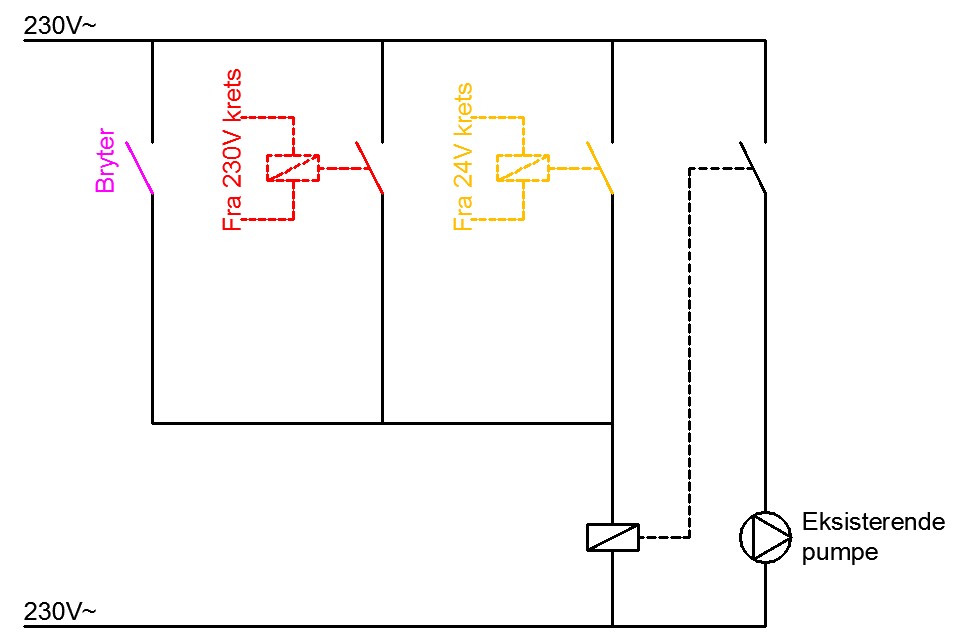 Pingla Skrevet 28. juli 2010 Skrevet 28. juli 2010 Ville brukt ett 24V relé, ett 230V relé og bryteren til å styre ett eget 230V relé for pumpen, da er alt galvaniskt skilt. Se vedlagte tegning.