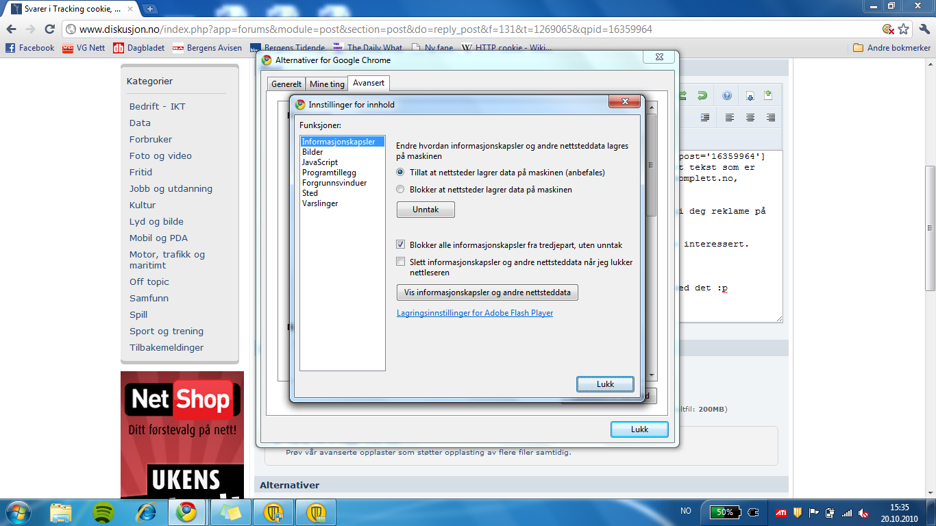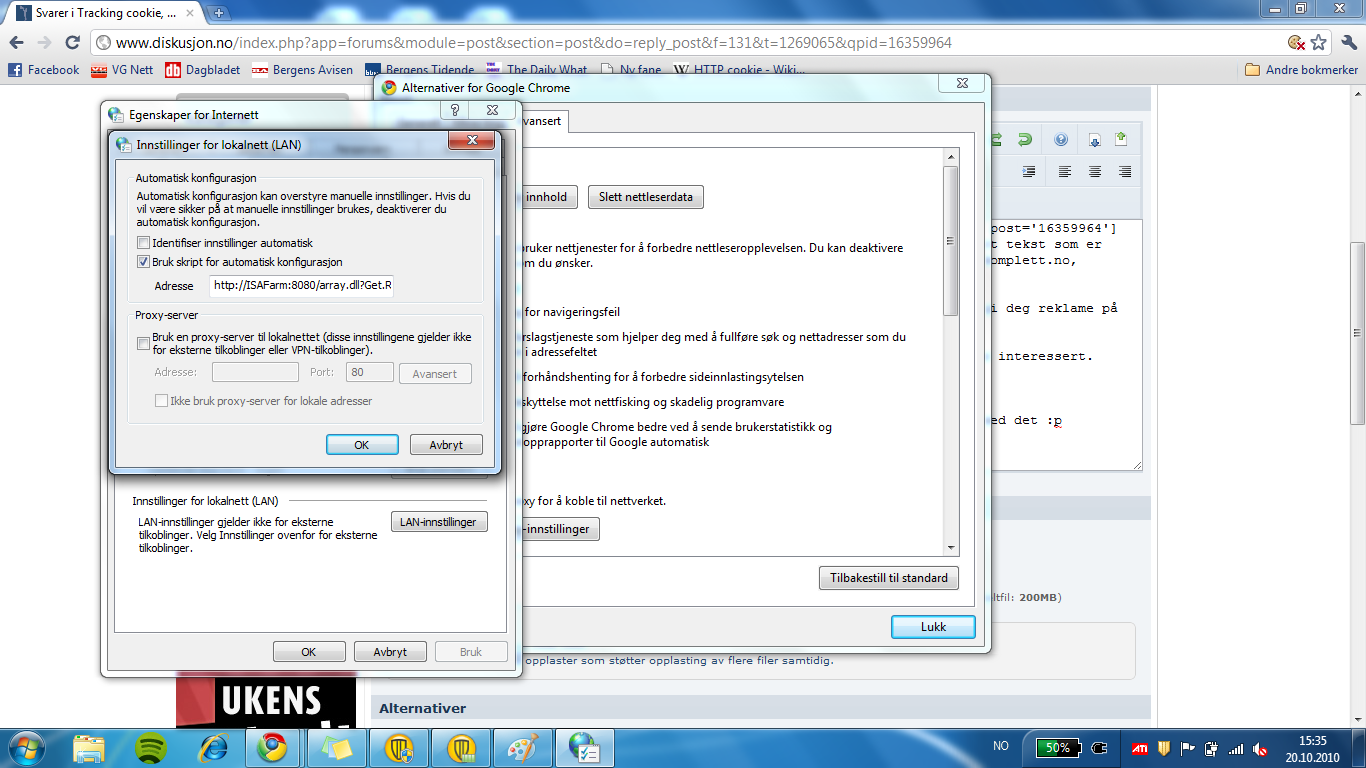 computerr Skrevet 20. oktober 2010 Forfatter Skrevet 20. oktober 2010 (endret) Tracking cookies er generelt sett ikke farlige etter min erfaring. Dette litt tekst som er lagret om f.eks sider du har vært innom, hva du har hatt i handlekurven på komplett.no, autentikasjonsgreier og mer. Dette er en måte for annosører å finne ut hva du surfer på, for deretter å gi deg reklame på akkurat dette. Vet FB har noen lignende som dette. Les wikipedia om du er interessert. Tusen takk for svar! Jeg kom på noe annet jeg lurte på hvis du kunne være så snill å hjelpe meg med det Hvis du ser på bildene jeg har lagt ved nå så er det noen instillinger (BILDE NR 1)jeg er usikker på hvordan skal være. Jeg antar at alle tredjeparts cookies bør være blokkert? (BILDE NR 2)Men denne jeg bruker nå er da en skoledata og skal jeg skru av "bruk skript for automatisk konfigurasjon" (antar at dette er til skolens server) når jeg er på andre nettverk enn på skolen? Og på "Identifiser innstillinger automatisk", den skal vel være av? Er ikke det sånn at hvis den er aktivert er blir det automatisk lagt til en proxxy? Eller er det bedre å ha den på? (har opplevd at den gjør dataen saktere). Endret 20. oktober 2010 av computerr