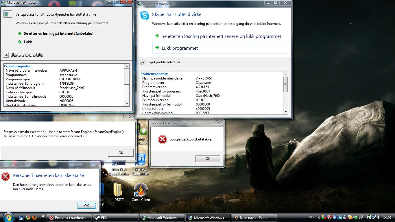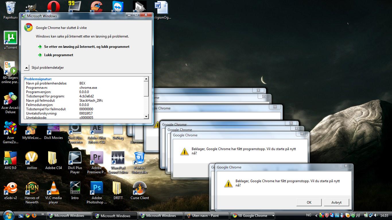 Christiαno Skrevet 27. oktober 2010 Skrevet 27. oktober 2010 (endret) Halloen! I går kveld så etter et russemotiv å ha på russekortet på laptopen, så jeg søkte rett og slett på russekort på Google Images. Jeg klikka på det femte bildet, og da fikk jeg en advarsel fra Google om at dette er en skadelig nettside eller noe. Og da poppa AVG opp og sa at de blokkerte en trussel, og i den trusselen var "chrome-update" eller noe nevnt, og at den var plassert i virus vault. Jeg gikk så vekk fra denne siden og tok et annet bilde, og fikk samme greia. Advarsel fra google om at nettstedet er farlig, pluss informasjon om at "chrome-update" eller noe var blokkert og plassert i virus vault. Og sånn ca 20 sekunder etterpå får jeg en blåskjerm, der hvor jeg ikke rakk å se hva det stod. Jeg fikk startet opp Windows (Vista), men så var det noe rart som skjedde. Det poppa opp flere vinduer som informerte meg om at programmer ikke kunne startes opp, blant annet Skype, Steam, "Personer i nærheteten", Google Desktop og "Vertsprosess for Windows-tjenester". Jeg så også at nettet ikke funker. Det ser ut som om jeg får kobla til nettverket, men det står at det er et uidentifisert nettverk, og at jeg bare får en lokal tilkobling. Windows Live Messnger funker, men for liten nytte når jeg ikke kan koble til nettet. Omtrent sånn ser det på skrivebordet ut etter at jeg har startet opp Windows og logget meg inn. Og så prøver jeg for moro skyld å gå inn på Google Chrome igjen. Da får jeg opp nøyaktig 18 vinduer som sier at Google Chrome ikke kunne starte og jeg får også et valg om å starte på nytt. Og det popper også opp noe greier som sier at "Datakjøringsforhindring har lokket Google Chrome for å beskytte datamaskinen din.". Hva kan være galt, og hvordan i huleste skjedde det? Jeg veit at nettet funker, siden jeg bruker min stasjonære til å skrive dette på det samme nettverket som laptopen prøver å koble seg til. Det er tydeligvis noe AVG har gjort, siden jeg ikke har hørt om noen nettsteder som fucker opp nettverkstilkoblingen på PCen og gjør at samtlig programmer slutter å fungere. PCen går også treigere, det tar blant annet lang tid å starte opp og programmer slutter å svare når de skal lagre filer, f. eks Paint. Og enda viktigere; hvordan får jeg fiksa på dette? Hadde vært fint om noen kom med forslag før jeg sender den inn på reparasjon. Det har også kommet en sånn diskkontroll mens jeg prøvde å starte opp i dag, og som jeg lot kjøre, men det hjalp ikke stort. Jeg har forresten en Acer Aspire 5738ZG. Om mer informasjon trengs er det bare å spørre så poster jeg fortløpende. Heldigvis kan jeg kopiere filer og sette dem inn på en minnepenn, så jeg får redda de viktigste filene mine. Om noen kan hjelpe meg med dette problemet står jeg i evig gjeld, for laptopen min er nærmest ubrukelig nå. Takk på forhånd! Edit: Slenger med en DxDiag også dersom det er av interesse for noen: ------------------ System Information ------------------ Time of this report: 10/27/2010, 14:25:57 Machine name: CHRISTIAN-ACER Operating System: Windows Vista™ Home Premium (6.0, Build 6001) Service Pack 1 (6001.vistasp1_gdr.100608-0458) Language: English (Regional Setting: Norwegian (Bokmål)) System Manufacturer: n/a System Model: n/a BIOS: n/a Processor: i/t (2 CPUs) Memory: 3066MB RAM Page File: 1174MB used, 5177MB available Windows Dir: C:\Windows DirectX Version: DirectX 10 DX Setup Parameters: Not found DxDiag Version: 6.00.6001.18000 32bit Unicode ------------ DxDiag Notes ------------ Display Tab 1: No problems found. Sound Tab 1: No problems found. Sound Tab 2: No problems found. Input Tab: No problems found. -------------------- DirectX Debug Levels -------------------- Direct3D: 0/4 (retail) DirectDraw: 0/4 (retail) DirectInput: 0/5 (retail) DirectMusic: 0/5 (retail) DirectPlay: 0/9 (retail) DirectSound: 0/5 (retail) DirectShow: 0/6 (retail) --------------- Display Devices --------------- Card name: NVIDIA GeForce G 105M Manufacturer: Chip type: DAC type: Device Key: Enum\PCI\VEN_10DE&DEV_06EC&SUBSYS_02051025&REV_A1 Display Memory: 1776 MB Dedicated Memory: 499 MB Shared Memory: 1277 MB Current Mode: 1366 x 768 (32 bit) (60Hz) Monitor: Generisk PnP-skjerm Driver Name: Driver Version: () DDI Version: 10 Driver Attributes: Final Retail Driver Date/Size: , 0 bytes WHQL Logo'd: n/a WHQL Date Stamp: n/a Device Identifier: {D7B71E3E-45AC-11CF-6F6D-0E2201C2CA35} Vendor ID: 0x10DE Device ID: 0x06EC SubSys ID: 0x02051025 Revision ID: 0x00A1 Revision ID: 0x00A1 Video Accel: ModeMPEG2_A ModeMPEG2_C ModeVC1_C ModeWMV9_C Deinterlace Caps: {6CB69578-7617-4637-91E5-1C02DB810285}: Format(In/Out)=(YUY2,YUY2) Frames(Prev/Fwd/Back)=(0,0,0) Caps=VideoProcess_YUV2RGB VideoProcess_StretchX VideoProcess_StretchY DeinterlaceTech_PixelAdaptive {5A54A0C9-C7EC-4BD9-8EDE-F3C75DC4393B}: Format(In/Out)=(YUY2,YUY2) Frames(Prev/Fwd/Back)=(0,0,0) Caps=VideoProcess_YUV2RGB VideoProcess_StretchX VideoProcess_StretchY {335AA36E-7884-43A4-9C91-7F87FAF3E37E}: Format(In/Out)=(YUY2,YUY2) Frames(Prev/Fwd/Back)=(0,0,0) Caps=VideoProcess_YUV2RGB VideoProcess_StretchX VideoProcess_StretchY DeinterlaceTech_BOBVerticalStretch {B338D50D-A64A-4790-AC01-475B64252A78}: Format(In/Out)=(YUY2,YUY2) Frames(Prev/Fwd/Back)=(0,0,0) Caps=VideoProcess_YUV2RGB VideoProcess_StretchX VideoProcess_StretchY DeinterlaceTech_BOBVerticalStretch {F9F19DA5-3B09-4B2F-9D89-C64753E3EAAB}: Format(In/Out)=(YUY2,YUY2) Frames(Prev/Fwd/Back)=(0,0,0) Caps=VideoProcess_YUV2RGB VideoProcess_StretchX VideoProcess_StretchY {6CB69578-7617-4637-91E5-1C02DB810285}: Format(In/Out)=(UYVY,UYVY) Frames(Prev/Fwd/Back)=(0,0,0) Caps=VideoProcess_YUV2RGB VideoProcess_StretchX VideoProcess_StretchY DeinterlaceTech_PixelAdaptive {5A54A0C9-C7EC-4BD9-8EDE-F3C75DC4393B}: Format(In/Out)=(UYVY,UYVY) Frames(Prev/Fwd/Back)=(0,0,0) Caps=VideoProcess_YUV2RGB VideoProcess_StretchX VideoProcess_StretchY {335AA36E-7884-43A4-9C91-7F87FAF3E37E}: Format(In/Out)=