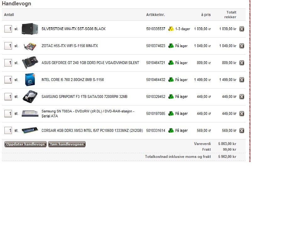 krroold Skrevet 5. desember 2010 Forfatter Skrevet 5. desember 2010 Legger ved noe greier her. Utdrag av handlekurv eksempel fra Dustin. Ser veldig greit ut. Noe tips til så lydløs CPU kjøler som mulig som passer inn i dette kabinettet?