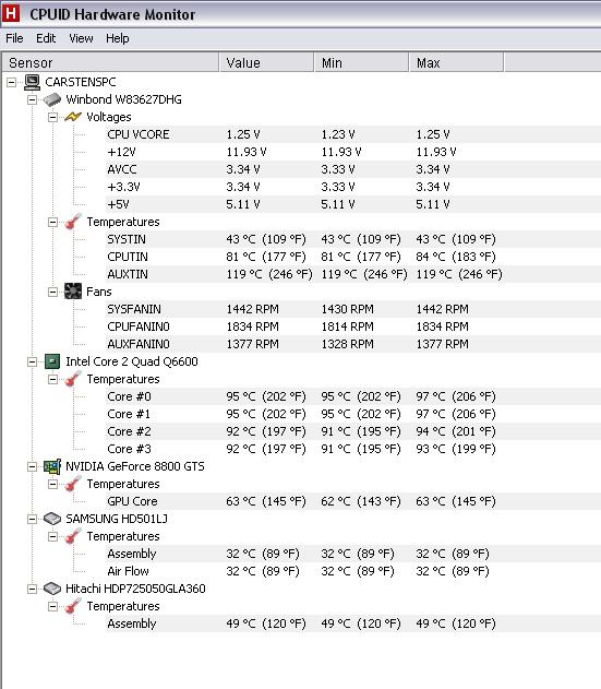 Bandidos-Pelle Skrevet 26. november 2010 Skrevet 26. november 2010 (endret) Hei! Jeg spør her siden jeg ikke er spesielt datakyndig i form av hardware, så da spør jeg likesågodt ekspertene her! Jeg har hatt en mistanke en ukes tid nå om at alt ikke var som det skulle, plutselig slo PC-en seg av da jeg åpnet et spill osv, så jeg lastet ned et temperaturmålerprogram og fikk svaret som ligger vedlagt. Uten at jeg har noen særskilt stor kompetanse på området, så virker 90-grader pluss på kjernene på quad coren min i overkant mye (), og jeg lurte på om noen vet hva jeg kan gjøre for å fikse det - er det viften (antar at det er en vifte på CPU-en) som har gått kaputt? Og hva slags vifte bør jeg isf. kjøpe? Jeg har kyndige kompiser som kan gjøre dette for meg, men må vite hva jeg bør gå til innkjøp av først. Sjekk ut vedlegget for temperaturinformasjon og kom med info på om det er enda mer galt enn på CPU-en (som jeg tror det er noe galt med) Endret 26. november 2010 av Bandidos-Pelle