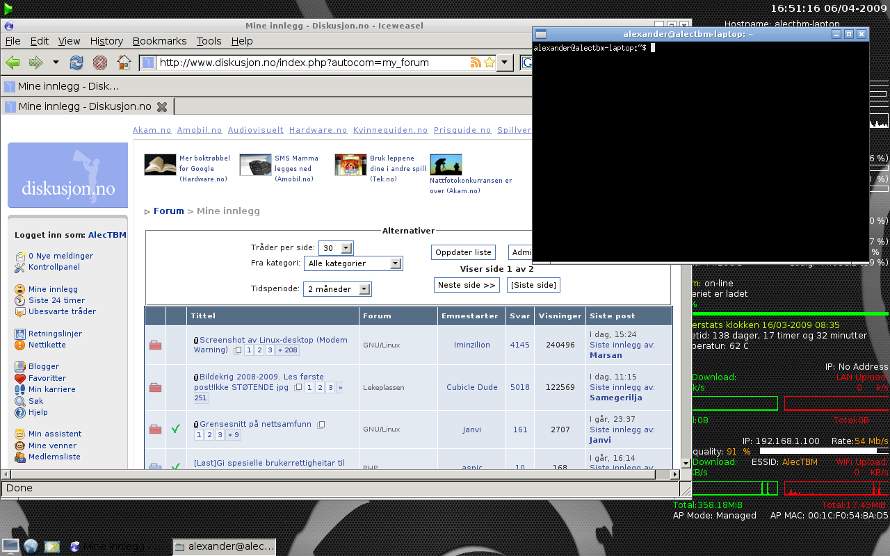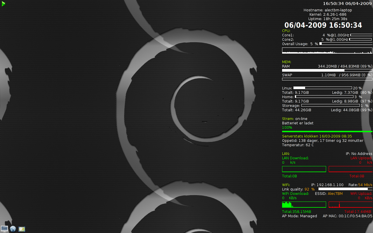 AlecTBM Skrevet 6. april 2009 Skrevet 6. april 2009 Da har jeg endelig blitt kvitt ubuntu skiten og lagt inn debian med openbox Panel: LXpanel Bakgrunn: Debian Steel Dark Mesh, modifisert av feh riktig nok Den jeg bruker: Ellers så er det conky på høyresiden med div ting Er litt småting igjen da, men det kommer seg