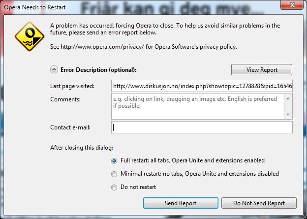 helsten2 Skrevet 20. desember 2010 Skrevet 20. desember 2010 (endret) Det nytter ikke å lese en blogg hvis formål er å samle rapporter om problemer for å skaffe seg et korrekt bilde. Du kan lese akkurat det samme hvis du besøker supportforumet på MozillaZine, eller supporforumet til Chrome. Dette er jeg helt uenig i. De som bruker denne bloggen er Opera-fans på sin hals, og når såpass mange av disse tunge brukerne har alle disse 'anmerkningene' så tar ihvertfall JEG dette som en indikasjon på kvaliteten av Opera 11.0 For meg personlig funker Opera 11 helt OK. Det eneste er endel random crash som har vært der siden 10.x. Jeg har installert samtlige snapshots, alphas, betas og RCs etter ver. 10.x, og jeg må også si at jeg ble overrasket over at de valgte å slippe ver. 11 så tidlig. EDIT (crash): EDIT2 (screen rendering): Det du må se på er hva folk generelt sier. Og det ser ikke ut som folk flest har så store problemer. ... og hvor finner jeg ut hva 'folk flest' mener? Folk flest (ja, de som har PC) vet faktisk ikke hva Opera er. Endret 20. desember 2010 av helsten2
