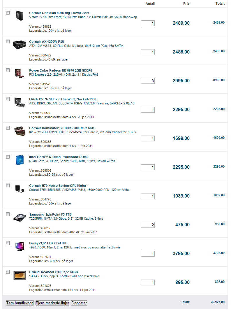 ManheiM Skrevet 16. januar 2011 Skrevet 16. januar 2011 Det er helt feil å kjøpe dette nå etter intels nye slipp, du burde også kjøpe andre minnebrikker/ 3-6pac da du vil sitte med 6 og ikke 4 spor. Syns jeg å, gå for de nye sandy bridge modellene, Intel Core i7-2600K eller intel Core i5 i5-2500K, de yter nesten identisk i spill, så ville nok godt for i5'en, men siden du har et såpass massivt budsjett er det ikke noe i veien å gå for i7'en. Kabinett er jo smak og behag, men vill anbefale deg å ta en titt på corsair sine 700D/800D. Men det er min mening, jeg har aldri syns at antec sine kabinetter har vært noe fine. Strømforsyning burde du gå for en modulær. Ta en titt på hx eller ax serien til corsair. Angående skjermkort, så ville jeg valgt nvidia 570 eller 580. 570 er det mest gunstige med tanke på pris vs ytelse, men hvis du vill ha det beste ville jeg ha valgt 580. Når det gjelder hovedkort, så er det ikke noe vitsig å gå for et hovedkort i 3000 kroners klassen, hvis det bare er myntet på litt gaming. De hk'ene er myntet på ekstreme overklokkere. Så ville ha spart inn litt der ja. Valg av skjerm er jo også litt smak og behag, men ville anbefale deg å ta en titt på noen 120 hz skjermer. for eksempel denne fra benq. Link Valg av snurre harddisker så er det fortsatt samsung f3 som gjelder. Med budsjettet ditt kan du evnt sette flere ssd'er i raid, men vet ikke hva du planlegger.