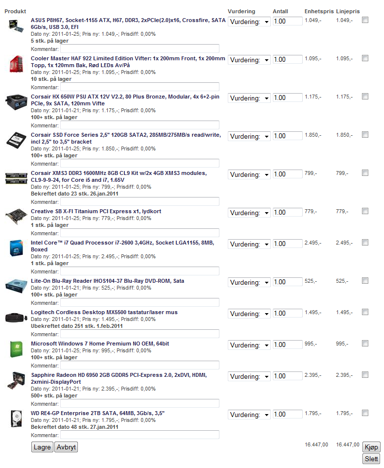 Bone Skrevet 25. januar 2011 Forfatter Skrevet 25. januar 2011 Sånn.. Nå har jeg sett litt nærmere, og byttet ut litt; Kabinett (får skjermkortet plass inni dette?), minne, hovedkort, cpu, lydkort, os.. Her er handleliste.. http://www.komplett.no/k/shoplist.aspx?mode=receive&si=885961&su=1DDBD3E5-DF7D-4DDF-AB3E-0E027FA2DC76 Noen som kan gi noen siste tilbakemeldinger!? Håper på å få bestilt i dag! Takker så meget for all hjelp!