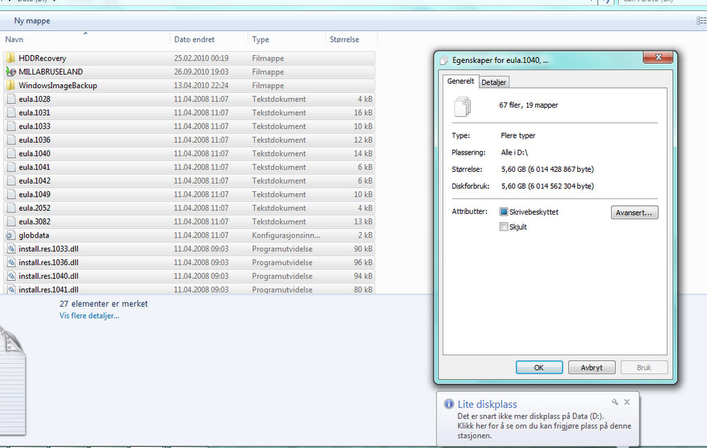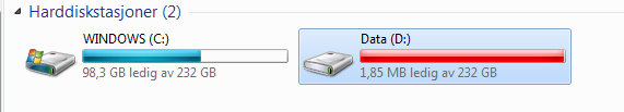 _Feroz Skrevet 6. februar 2011 Skrevet 6. februar 2011 Heisann. Se bildene. Det er snakk om en Toshiba Satellite T130-laptop med 320gb HDD. Eieren får beskjed om at det er lite diskplass på stasjon D: hele tiden, men det står at det er 232gb kapasitet på denne disken (det kan ikke stemme, siden det er 232gb på C:). Hvis man går inn på D:, og markerer alt og trykker "egenskaper", så får man til informasjon at det er ca. 5,2gb brukt diskplass på denne disken. Hva bør jeg gjøre for å få bukt med problemet?