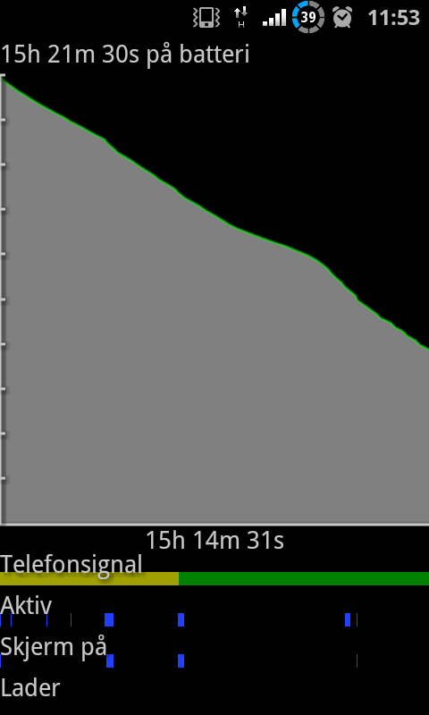 dabear Skrevet 26. juli 2011 Skrevet 26. juli 2011 Batteriet er ikke defekt. Man ser på grafen at telefonen har vært aktiv (mens skjermen har vært av) i tidsperioden. Post også hvert sitt bilde av tjenestene som går, og av strømforbruk applikasjons-messig. I natt drog jeg ut strømkabelen litt før jeg la meg, og lot den ligge over natta. 60% batteribruk på 15 timer uten bruk. Android bruker 98%..