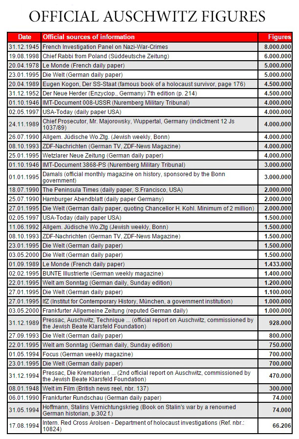 partlyinsaine Skrevet 13. juli 2017 Skrevet 13. juli 2017 World Almanac før revisjonen med estimat i 1949. Litt mer om UNRRA og Fredrick Morgans "antisionistiske påstander" Litt mer om tallfesting og UNRRA kontroversen Så kan vi jo filosofere over hvordan retorikken endret seg etter 1948 da Israel faktisk ble opprettet. Tør jeg spørre hvor du finner alle disse meget interessante avisutklippene? Er det egen research? Søker på Google, avisarkiv og plukker med meg det jeg kan der jeg kan. Levde nemlig som konformiteten hadde forventet. Full tro på at det man blir fortalt er riktig. Syntes så det var litt rart at de første avisklippene jeg kom over ikke nevnte holocaust som vi kjenner det idag, men fastholdt 6 millioner. Klarte ikke helt å forstå hvorfor en hendelse som er påstått å være så godt "dokumentert" skapte så lite dokumentasjon i aviser fra tiden etter 1945. Vedlagte liste viser variasjonen over dødsfall i Auschwitz, og dersom jeg er en benekter fordi jeg er tvilende til det narrativet man blir fortalt, lurer jeg på om man også var fornekter om man tvilte på 8 millioner eller 4 millioner. Som vi ser av klipp nr 2; Her er er det åpent innrømmet at 4 millioner er en overdrivelse. Og at dette tallet har vært gjenstand for revisjon en lang stund. Altså ingen grunn for å kalle noen benektere ved å tvile på 4 millioner. Samme med Mauthausen. Offentliggjort tall fra 1963 og dagens tall har ett skille på 1.9 millioner. Majdanek er samme sak med: Ned fra 2 millioner til 78000. Det vi ser, uten at vi trenger å si noe, eller å debattere noe, er en stadig nedskriving av offisielle tall, og kurven peker fremdeles nedover. Så det er på bakgrunn av dette jeg lurer på hvorfor man sitter med navnekalling, nazisympatisør og i noen tilfeller drar argumentet over i andre debatter og kaller dem man diskuterer med for "holocaustbenektere", uten å peke på hva man faktisk benekter. Ingen som ønsker å bli tatt seriøst vil hevde at tapstallene i leirene var 0, fordi det finnes mye dokumentasjon som tilsier at forholdene i leirene, spesielt etter 1944 forverret seg radikalt. (Kan dette ha sammenheng med D-dagen og tapene på østfronten å gjøre tro), hvor man blir forledet til å tro at dette med jødene opptok Tyskland i ett og alt. Dokumentasjonen tilsier helt noe annet, så som sagt, noen feriekoloni var det ikke snakk om. Derimot er ikke hva man tror, eller ikke tror noe valid argument, siden påstandene ofte går på "overveldende" dokumentasjon. Dersom vi lager ett hypotetisk scenario, og sier at vitnene lyger, dem lever på utelukkende på antitysk propaganda, så sitter vi igjen med omtrent ingenting av skriftlig eller fysiske bevis som støtter det offisielle narrativet.