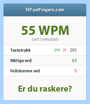 Dr. Brodsky Skrevet 24. april 2011 Skrevet 24. april 2011 Du skriver 362 bokstaver per minutt Du har 81 riktige ord og du har 3 feile ord. Jeg lå/satt i sengen med en laptop, men tror egentlig ikke at jeg klarer så mye bedre.