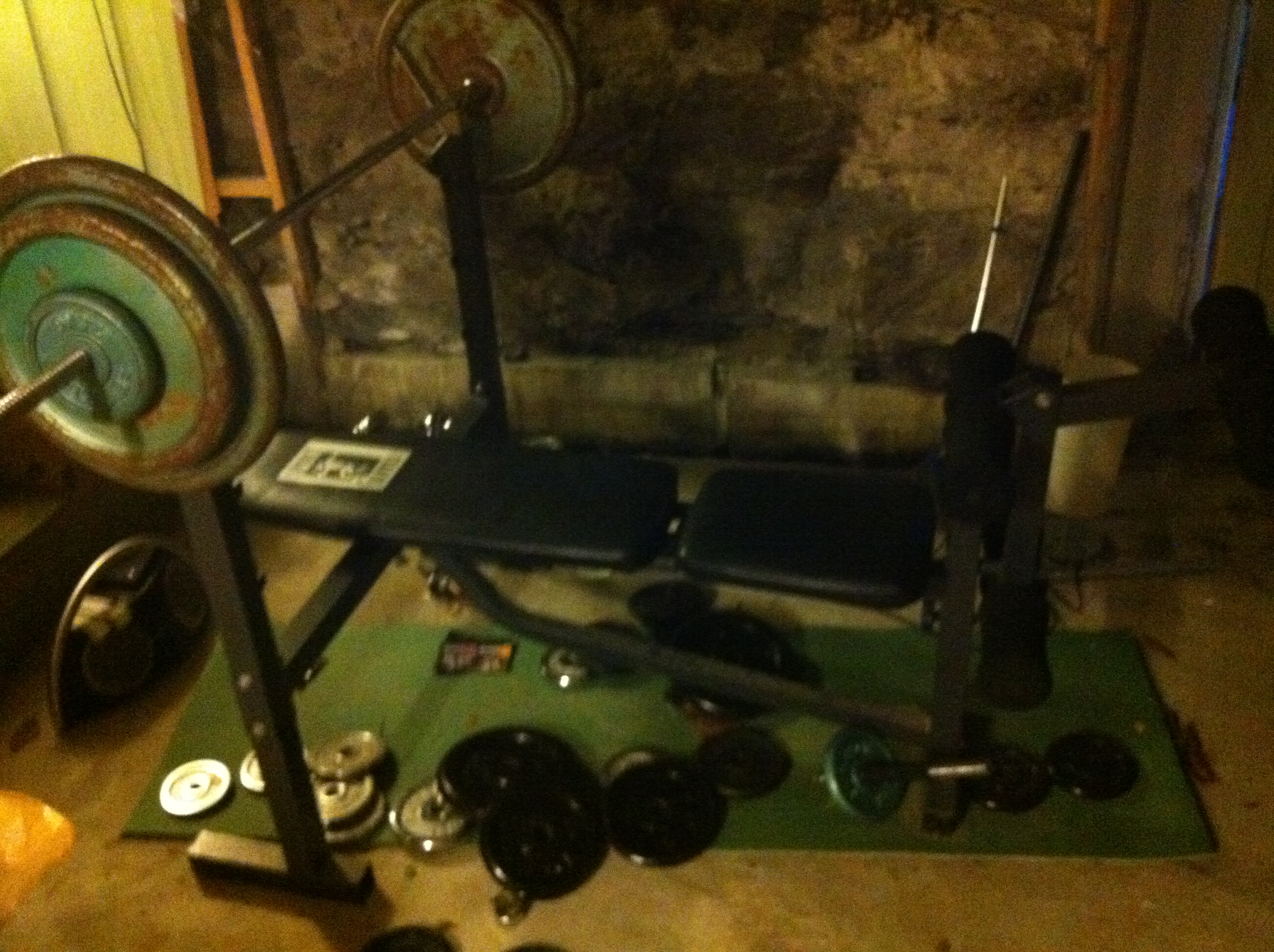 Her har jeg det meste jeg trenger for å trene bryst, biceps og triceps, som feks. EZ-stang, hammercurl bar, løsvekter og benkpres-stang. Samt en hel del med store og mindre vekter.