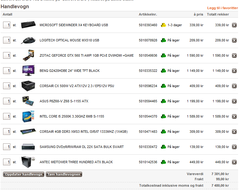 Du skal klare å få en maskin med INTEL CORE I5 2500K 3.30GHZ og et GTX 560 for 7500 fra Dustinhome..