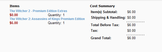AvidGamer Skrevet 18. juli 2011 Forfatter Skrevet 18. juli 2011 (endret) Slo til, jeg. Bekreftelsesmailen lar vente på seg, men jeg har screenshot av kvitteringen, så ... Jeg krangler hvis de skrur opp prisen. Enig med deg der. Finner du spillet i impulse programmet? Der eller på websiden, er bare å gå på "sales", så ser du den der. Eller bare søk på "Witcher 2". Tok screen jeg også, men du finner den under "Account" og "Print Invoices (View Past Orders)" Endret 18. juli 2011 av AvidGamer
