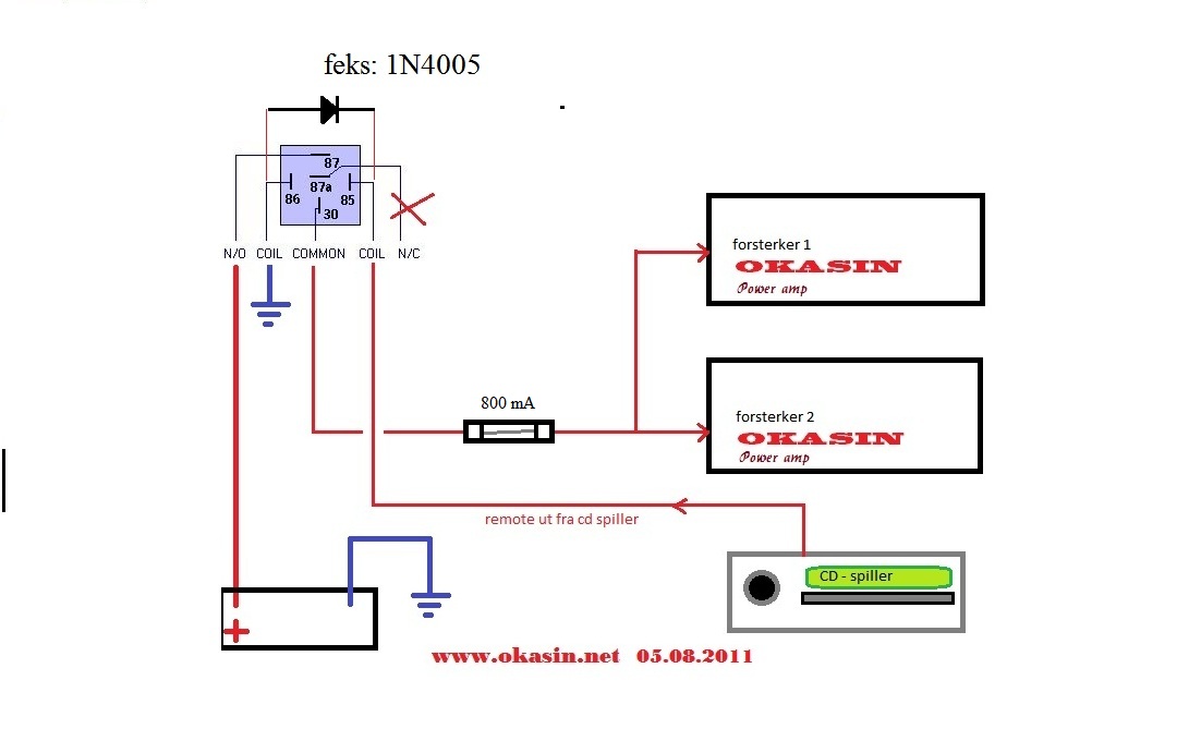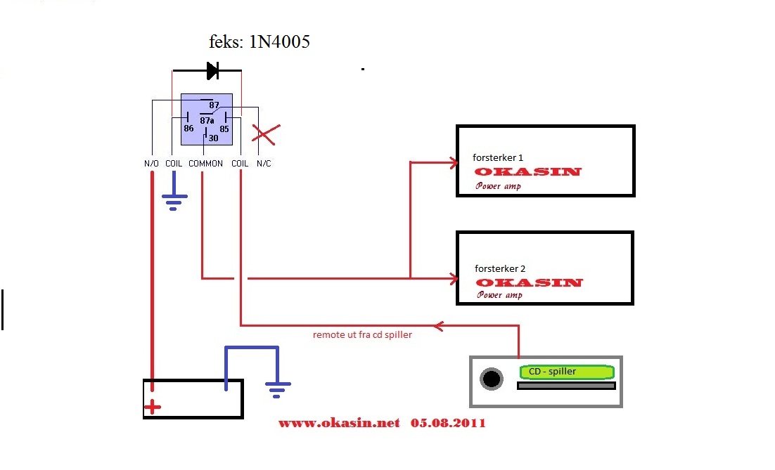 Takkformeg Skrevet 4. august 2011 Skrevet 4. august 2011 Hei og håå. Tenkte jeg skulle koble remote via et relè da jeg skal styre 2 forsterkere og et nytt relè som skal bryte jordingen til voltmeteret i koblingsblokken. (Ikke tegnet inn det releet) Så da lurer jeg på hvordan jeg skal koble? Slik som bildet? Trenger jeg noen sikringer noen plass? Leste en plass at man bør ha på en diode på remoten slik at den ikke kan få tilbakeslag med høy spenning bør jeg det? Hvordan koble ? Det som er veldig VIKTIG å vite er at et relè består av en spole som igjen kan lage krøll for spilleren din. Grunnen til det er at det i enkelte tilfeller oppstår en høy spenning som sendes tilbake til spilleren (her var jeg litt dårlig til å forklare men..)...resultat? Jo.. "brent" remote-utgang på spiller...Dette kan enkelt løses ved å koble på en diode "over" spolen. Flere relè`er har dette innebygget så da er saken grei, men greit å sjekke om ditt relè har det før du går i gang.