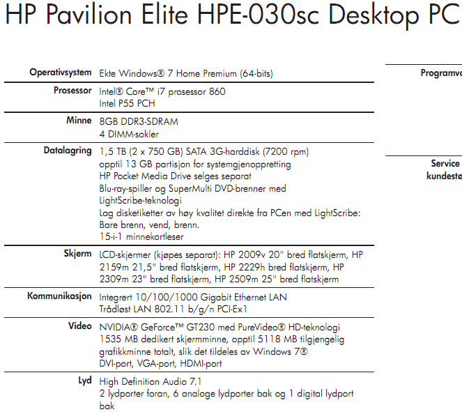 Josa04ai Skrevet 25. august 2011 Forfatter Skrevet 25. august 2011 I tilfelle det er dårlig stemning å laste ned og åpne bilder (vet ikke om slikt kan inneholde virus:) så legger jeg ved spesifikasjonene her i tekst-format: Operativsystem Ekte Windows® 7 Home Premium (64-bits) Prosessor Intel® Core™ i7 prosessor 860 Intel P55 PCH Minne 8GB DDR3-SDRAM 4 DIMM-sokler Datalagring 1,5 TB (2 x 750 GB) SATA 3G-harddisk (7200 rpm) opptil 13 GB partisjon for systemgjenoppretting HP Pocket Media Drive selges separat Blu-ray-spiller og SuperMulti DVD-brenner med LightScribe-teknologi Lag disketiketter av høy kvalitet direkte fra PCen med LightScribe: Bare brenn, vend, brenn. 15-i-1 minnekortleser Skjerm LCD-skjermer (kjøpes separat): HP 2009v 20" bred flatskjerm, HP 2159m 21,5" bred flatskjerm, HP 2229h bred flatskjerm, HP 2309m 23" bred flatskjerm, HP 2509m 25" bred flatskjerm Kommunikasjon Integrert 10/100/1000 Gigabit Ethernet LAN Trådløst LAN 802.11 b/g/n PCI-Ex1 Video NVIDIA® GeForce™ GT230 med PureVideo® HD-teknologi 1535 MB dedikert skjermminne, opptil 5118 MB tilgjengelig grafikkminne totalt, slik det tildeles av Windows 7® DVI-port, VGA-port, HDMI-port Lyd High Definition Audio 7.1 2 lydporter foran, 6 analoge lydporter bak og 1 digital lydport bak