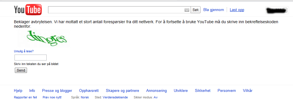 kjelle392 Skrevet 21. oktober 2011 Forfatter Skrevet 21. oktober 2011 Takker for svar begge to. I dag hendte det faktisk hele 3 ganger. Jeg har vært på jobb i hele dag, men når jeg kom hjem og gikk inn på youtube så kom meldingen tvert. Så tok jeg laptopen, og fikk samme der. Jeg angav den captcha-koden som stod, men når jeg kom tilbake til den stasjonære, så fikk jeg jammen samme melding der også... Kjører et virussøk så får vi se, men vil bli overrasket om det dukker opp noe da jeg har Avast kjørende hele tida.