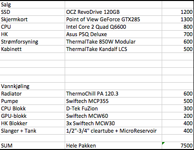 Reeve Skrevet 1. november 2011 Forfatter Skrevet 1. november 2011 Først og fremst må jeg ikke ha 5000 kroner. Jeg kan kaste alt og kjøpe de nye delene, men vi selvsagt få så mye for dem som mulig (uten å direkte svindle noen). Jeg har justert alle prisene slik arni beskriver, også de jeg er delvis uenig med han i. Som du ser er nå dyreste delen SSD-en som jeg kjøpte for et par mnd siden. Resten er også justert, bl.a. vannkjølingen som nå er 100 kroner per blokk. Spesifikt hvilken pris er urimelig nå, i forhold til nypris for komponenter med tilsvarende ytelse?
