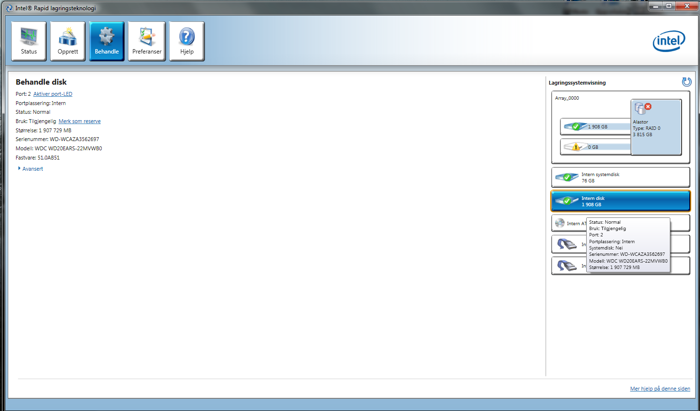 alastor_666 Skrevet 20. november 2011 Skrevet 20. november 2011 Hei, Jeg har 2 stk Western digital 2TB disker konfigurert i raid! Mens jeg satt og spilte Skyrim fryser plutselig PCen og jeg måtte restarte manuelt. Alle innstillinger i Bios ble tilbakestilt. Jeg måtte dermed forandre "configure hdd as" tilbake til sata. I oppstarten står det at det er problemer med Raid 0 konfigurasjon. "Status - failed"! Inne i Windows viser Intel Rapid programmet at Raid har sviktet. Men som dere ser på bildet ser det ut til at disken fungerer normalt, men den finnes ikke i raid konfigurasjonen lengre. I oppstarten er status på den ene disken "non member disk". Mitt spørsmål er; kan jeg slette raid konfigurasjonen, opprette en ny, og beholde alle dataene? Finnes det eventuelt noen andre alternativer for å løse dette? Har dessverre en del filer som ikke er kjørt backup av så dette passet meget dårlig! På forhånd takk! kan dette funke: http://www.overclock.net/t/478557/howto-recover-intel-raid-non-member-disk-error