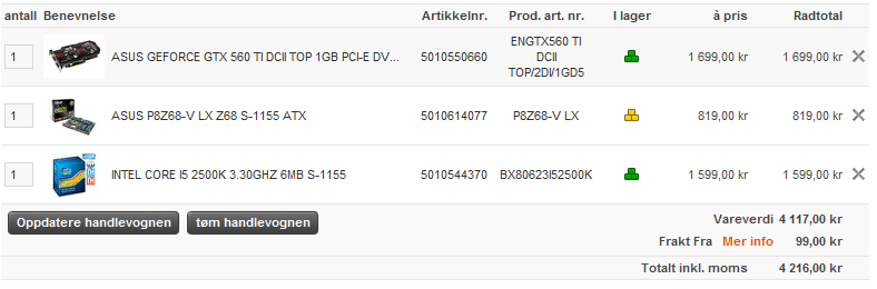 andnet Skrevet 2. desember 2011 Skrevet 2. desember 2011 Trenger å oppdragere pc til BF3, ønsker å bruke "så lite som mulig" men naturligvis om 200kr ekstra øker ytelse betraktlig, så går jeg heller for det. Tenkte på f.eks følgende fra komplett.no: CPU Intel® Core i5-2500K Processor 1549 kr HK MSI H61MA-E35 (B3), Socket-1155 590 kr GFX MSI GeForce GTX 560Ti 1GB PhysX 1799 kr Er dette en bra pakke eller noen som har et bedre forslag?