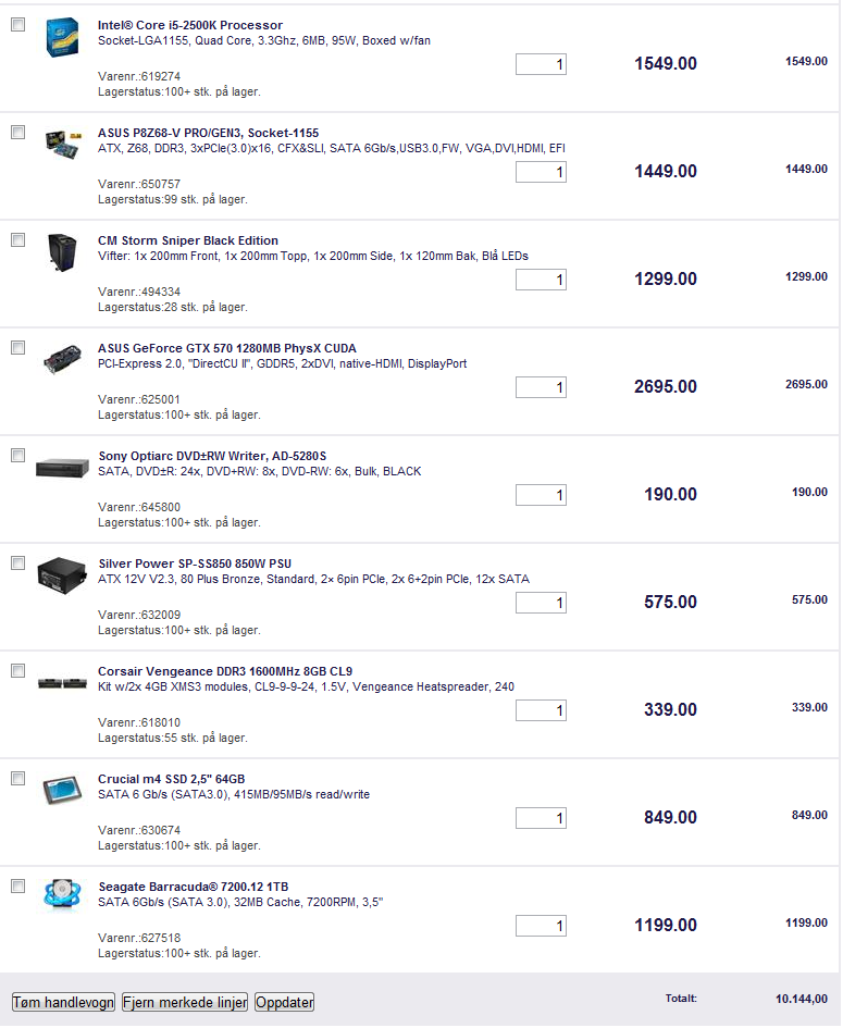 Olestokk Skrevet 3. desember 2011 Skrevet 3. desember 2011 (endret) sorry for at jeg glemte å skrive det har istad, men har du noe maks-budsjett? her satte jeg opp noe for deg: The Elder Scrolls V: Skyrim CM Storm Sniper Black Edition Silver Power SP-SS620M 620W PSU Intel® Core i5-2500K Processor ASUS P8Z68 Deluxe, Socket-1155 Corsair Vengeance DDR3 1600MHz 8GB CL9 EVGA GeForce GTX 570 HD 1280MB PhysX Crucial m4 SSD 2,5" 64GB Seagate Barracuda® 7200.12 1TB Sony Optiarc DVD±RW Writer, AD-5280S Logitech OEM S-120 2.0 høyttaler MS COA Label Windows Home Premium 7 MS DVD Win H.P/Pro/Ultimate 7 NO 64bit MS ROYALTY Win Home Premium 7 Nordic Garanti 3 år - Sende inn dette er en av de komplett bygger for deg. den kommer på ca. 11700kr valgte bort i7en fordi den er unødvendig i spill. satte inn i5 2500K valgte bort 16GB RAM fordi det er ca. 400% så mye RAM som du trenger, satte inn 8GB fordi RAM er så billig og kan være nyttig i fremtiden. byttet SSD til Crucial M4, den er passe rask og er den mest stabile SSDen på markedet i dag MEN, jeg vil anbefale deg en ting: bygg PC selv noen gode grunner til det er at det er både morsomt, lærerikt og ikke minst billigere. (vanligvis anbefaler jeg Dustinhome.no, men siden komplett hadde noen gode tilbud på noen gode deler velger jeg å gå for komplett) i bildet under har jeg lagt til en handleliste på deler for hvis man bygger selv, det er litt bedre ytelse (bedre kjøling på grafikkort og bedre strømforsyning) i tillegg får man plass til en bra luftkjøler for prosessoren og fortsatt kunne være under 12K kabinett er en smak og behag sak, men Fractal design R3 anbefales for: stilrent design, god lufting og det er veldig godt lydisolert Edit: klarte å gjøre den fatale feilen å glemme å legge til Windows 7................. det betyr en høyere pris på selvbygd fordi jeg valgte et dyrt grafikkort men en enda bedre grunn til å vente med å kjøpe er at i starten av januar kommer AMD sine nye Grafikkort ut, de er verdt å vente på. MVH Olestokk Endret 3. desember 2011 av olestokk