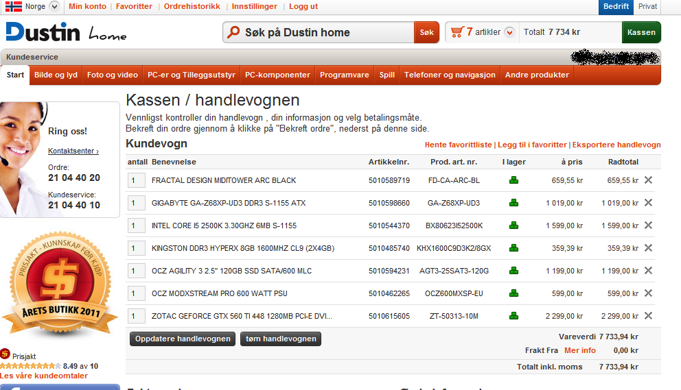 Ar`Kritz Skrevet 5. desember 2011 Skrevet 5. desember 2011 Her er for øvrig mitt forslag. Merk at prosessor, skjermkort og SSD er på tilbud, og strømforsyningen nylig har vært på tilbud (så den kan komme på tilbud igjen). Selv ville jeg kanskje lagt litt mer penger i en strømforsyning. Kabinettet kan du jo kjøpe på dustinhome siden det er billigere der, og det vil bli fraktet som eget kolli uansett. 1