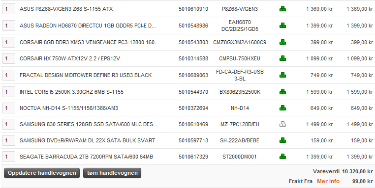Olestokk Skrevet 8. desember 2011 Skrevet 8. desember 2011 (endret) dette var hva jeg kom fram til: grafikkortet skal holde ut til HD 7979 kommer ut. (oppsettet er lagt opp til å takle prisen på det ) en skikkelig prosessorkjøler, fordi budsjettet takler det. kabinettet er en smak og behag sak, det handler om å finne det som er best for kompisen din etter hvordan han vil ha det, altså om det skal være et skikkelig "gamer" kabinett med masse lys, eller om det skal være stilrent. vindu eller ikke, stillhet? grunnen til at jeg satte inn det kabinettet er at det er noe som passer for de fleste i og med at det har den plassen du trenger, det er stille og stilrent, i tillegg koster det ikke så mye, og det er solid bygd. jeg liker for eksempel Corsair sin Obsidian serie SSDen har jeg valgt dordi det er en av de beste når det kommer til stabilitet, og den er ikke treig heller HDD er fra den nye versjonen av seagate barracuda serien, overraskende at den var så billig for 2TB PSU er fra Corsair HX serien, som har god kvalitet, den skal også kunne støtte 2 grafikkort i CrossfireX hvis det blir nødvendig i fremtiden RAM er Corsair vengeance, som gir det du trenger, hvis du går lengre opp i pris får du ikke noe mer for panga, så klart kan du spare ca 90kr på å gå for billigere kingston ValueRAM eller en billig HyperX pakke. men som en bonus kommer Vengeance Serien med et stilig design Edit på RAM: Vengeance LP ville passet bedre inn pga. kjøleren jeg valgte krasjer med de høye RAM brikkene. --------------------------------------------------------------------------------------------- når det kommer til bærbar PC så vet jeg ikke helt hva den skal brukes til, men jeg antar at det primært er spilling? da er denne et godt valg, kraftigere grafikkort enn den Dell PCen. eller eventuelt denne, på den sistnevnte et det en fire kjerners prosessor som vi øke ytelse i spill som bruker flere kjerner, som for eksempel BF3 --------------------------------------------------------------------------------------------- når det kommer til butikk er Dustinhome.no det beste valget, med gode priser og god service Edit: masse info Endret 8. desember 2011 av olestokk