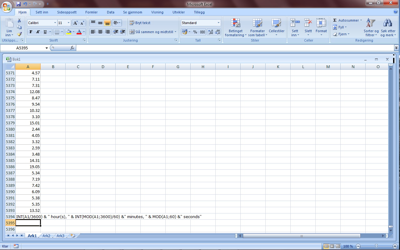 evmorten Skrevet 11. desember 2011 Forfatter Skrevet 11. desember 2011 INT(A1/3600) & " hour(s), " & INT(MOD(A1;3600)/60) &" minutes, " & MOD(A1;60) &" seconds" Takk for svar, men jeg får det ikke til Jeg legger ved fil av hvordan det ser ut, så kanskje det som er feil kan sees?