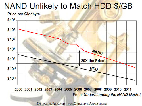 Visjoner Skrevet 15. desember 2011 Skrevet 15. desember 2011 Har de lav watt per GB? En moderne SSD-bruker fort en 3 watt, vs kanskje 12 watt for en 3,5-disk, som gjerne har 20 ganger mer plass. Ditto med størrelse per i dag. Man får jo 2,5 HDDer på 1 TB. Folk har ihvertfall her på forumet vært veldig optimistiske mtp hvor raskt SSD skal ta over, mer edruelige spådommer har vunnet fram hittil. Tror faktisk ikke det er hensiktsmessig å operere med 20-gangern lenger når det gjelder plass. Foreløpig får du 600GB (1TB rundt hjørnet) SSD i 2.5" format. Dvs at SSD omtrent har tatt igjen HDD på GB/volum. Hvordan var den situasjonen for to år siden, og er denne tettheten begrenset av pris eller av tilgjengelig teknologi? Vet ikke hvordan en 1TB SSD gjør det på power-siden, men den vil vel neppe bruke like mye som en 1TB snurredisk? Her (GB/watt) har vel SSD også hatt en mye raskere utvikling? Og hva med ytelsen? Hvordan har ytelsen på SSD-disker utviklet seg de siste årene, sammenliknet med HDD? Jeg tror vi er midt oppi en gigantisk forbikjøring på samtlige av disse punktene... Her er det ingenting som tyder på at HDD vil erstattes som masselagringsmedium på veldig mange år. Her ser du kun på pris. Pris er ikke nødvendigvis den avgjørende variabelen. Prisutviklingen vil også stagnere på HDD etterhvert som de mister flere og flere markeder. Det ville vært interessant å se tilsvarende grafer av utviklingen på de tre variablene nevnt over. Mistenker at det ville sett ganske mørkt ut for HDD, og overveldende lyst for SSD. -GB/watt -GB/volum -ytelse