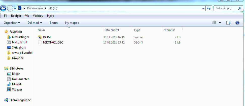Tubaole Skrevet 31. desember 2011 Forfatter Skrevet 31. desember 2011 Dette er et minnekort fra et kamera, så det burde ikke være snarveier på den. Når jeg kobler til kameraet (med minnekortet inni) med kabel, får jeg fram filene.