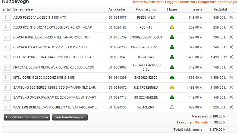SirAmp Skrevet 19. januar 2012 Skrevet 19. januar 2012 1|ASUS P8Z68-V LX Z68 S-1155 ATX|5010614077|P8Z68-V LX|1-3 dager|849,00|849,00| 1|CORSAIR 8GB DDR3 XMS3 INTEL I5/I7 PC10666 1333MHZ (2X4GB)|5010485109|CMX8GX3M2A1333C9|I lager|349,00|349,00| 1|CORSAIR CX 500W V2 ATX12V 2.3 / EPS12V PSU|5010596234|CMPSU-500CXV2EU|I lager|499,00|499,00| 1|INTEL CORE I7 2600K 3.40GHZ 8MB S-1155|5010544373|BX80623I72600K|I lager|2┬á499,00|2┬á499,00| 1|SAMSUNG DVD┬▒R/RW/RAM DL 22X SATA BULK SVART|5010597713|SH-222AB/BEBE|I lager|149,00|149,00| 1|SEAGATE BARRACUDA 1TB 7200RPM SATA/600 64MB|5010617326|ST1000DM003|I lager|959,00|959,00| 552 + frakt over budsjett hos Dustinhome men gadd ikke begynne på nytt.