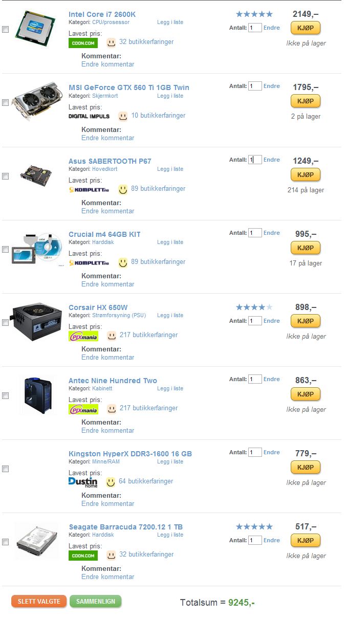 Jack123 Skrevet 22. januar 2012 Forfatter Skrevet 22. januar 2012 (endret) Tussen takk for Svaret Overklokking er noe jeg har null erfaring med så tror ikke det blir noe overklokking i fremtiden jeg fant noen deler på komplett og kom fram til dette: http://www.komplett.no/k/ki.aspx?sku=627518 http://www.komplett.no/k/ki.aspx?sku=659815 http://www.komplett.no/k/ki.aspx?sku=626388 http://www.komplett.no/k/ki.aspx?sku=619272 http://www.komplett.no/k/ki.aspx?sku=460922 http://www.komplett.no/k/ki.aspx?sku=585007 http://www.komplett.no/k/ki.aspx?sku=623122 Er dette et godt valg? Endret 22. januar 2012 av Jack123