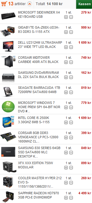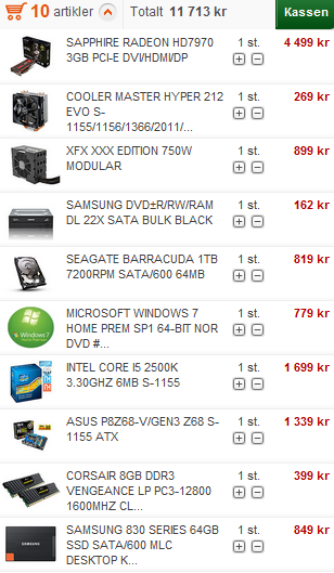 Swiggle Skrevet 1. mars 2012 Forfatter Skrevet 1. mars 2012 (endret) Jeg har laget en liten liste her som jeg vil at dere skulle ta en liten titt på, kanskje forandre litt. Prisen var litt i overkant dyr med tanke på at jeg skal ha et headset også Setter pris på all tilbakemelding ASUS P8P67 DELUXE B3 P67 S-1155 ATX 5010552342 P8P67 DELUXE B3 1 549,00 kr 1 549,00 kr CORSAIR GS 800W ATX12V 2.3 / EPS12V PSU 5010546558 CMPSU-800GEU 849,00 kr 849,00 kr INTEL CORE I7 2700K 3.50GHZ 8MB S-1155 5010610782 BX80623I72700K 2 399,00 kr 2 399,00 kr MICROSOFT WINDOWS 7 HOME PREM SP1 64-BIT NOR ... 5010587516 GFC-02061 779,00 kr 779,00 kr NZXT FULLTOWER PHANTOM ATX BLACK 5010587454 PHAN-001BK 1 069,00 kr 1 069,00 kr OCZ VERTEX 3 2.5" 120GB SSD SATA/600 MLC 5010579654 VTX3-25SAT3-120G 1 260,00 kr 1 260,00 kr QPAD|CT Medium - musematte 5010104005 3801 159,00 kr 159,00 kr RAZER BLACKWIDOW MECHANICAL KEYBOARD 5010519149 RZ03-00390600-R3N1 649,00 kr 649,00 kr RAZER MAMBA 2012 ELITE ERGONOMIC WIRELESS GAM... 5010619626 RZ01-00120400-R3G1 829,00 kr 829,00 kr SAMSUNG SYNCMASTER S22A300B 21,5" WIDE TFT LE... 5010587848 LS22A300BS/EN 1 099,00 kr 1 099,00 kr SAPPHIRE RADEON HD6970 2GB GDDR5 PCI-E DVI/HD... 5010588680 11187-00-40R 2 989,00 kr 2 989,00 kr SEAGATE BARRACUDA GREEN 2TB 5900RPM SATA/600 ... 5010544312 ST2000DL003 899,00 kr 899,00 kr Oppdatere handlevognen tøm handlevognen Vareverdi 14 529,00 kr Frakt Fra Mer info 99,00 kr Totalt inkl. moms 14 628,00 kr Endret 1. mars 2012 av Swiggle
