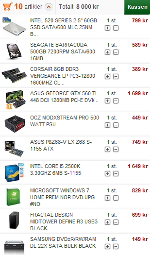 Olestokk Skrevet 19. mars 2012 Skrevet 19. mars 2012 (endret) Til gaming går du for Intel i5-2500k. Den gruser selv AMD sine 8-kjerner på de fleste spill. Som postet over er nok Dustinhome billigere enn mpx. Nja, både Intel i5 2500K og AMD FX-8120 er billigere på mpx! alt i alt er dustin billigere... og ja, 120GB SSD er optimalt, men jeg akter ikke drive med ulovligheter for å oppnå høyere SSD størrelse, en ting man kan gjøre med en SSD på den størrelsen hvis det er for lite er at man kan sette den som Cache via SRT så harddisken blir raskere Endret 19. mars 2012 av olestokk