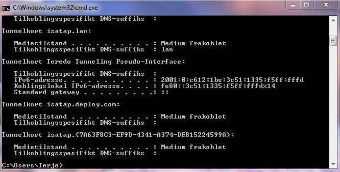 billywillie Skrevet 21. april 2012 Forfatter Skrevet 21. april 2012 Da gjør vi et nytt forsøk Microsoft Windows [Versjon 6.1.7601] Copyright © 2009 Microsoft Corporation. Med enerett. C:\Users\Terje>ipcofig ipcofig gjenkjennes ikke som en intern eller ekstern kommando, kjørbart program eller satsvis fil. C:\Users\Terje>ipconfig Windows IP-konfigurasjon Trådløst LAN-kort Trådløs nettverkstilkobling: Tilkoblingsspesifikt DNS-suffiks : lan Koblingslokal IPv6-adresse. . . . : fe80::3c48:61a5:9055:aa43%12 IPv4-adresse. . . . . . . . . . . : 10.0.0.2 Nettverksmaske . . . . . . . . . .: 255.255.255.0 Standard gateway . . . . . . . . .: 10.0.0.138 Ethernet-kort Lokal tilkobling 2: Medietilstand . . . . . . . . . . : Medium frakoblet Tilkoblingsspesifikt DNS-suffiks : deploy.com Ethernet-kort Lokal tilkobling: Medietilstand . . . . . . . . . . : Medium frakoblet Tilkoblingsspesifikt DNS-suffiks : Tunnelkort isatap.lan: Medietilstand . . . . . . . . . . : Medium frakoblet Tilkoblingsspesifikt DNS-suffiks : lan Tunnelkort Teredo Tunneling Pseudo-Interface: Tilkoblingsspesifikt DNS-suffiks : IPv6-adresse. . . . . . . . . . . : 2001:0:c612:1f2:3c29:39f1:f5ff:fffd Koblingslokal IPv6-adresse. . . . : fe80::3c29:39f1:f5ff:fffd%14 Standard gateway . . . . . . . . .: :: C:\Users\Terje>