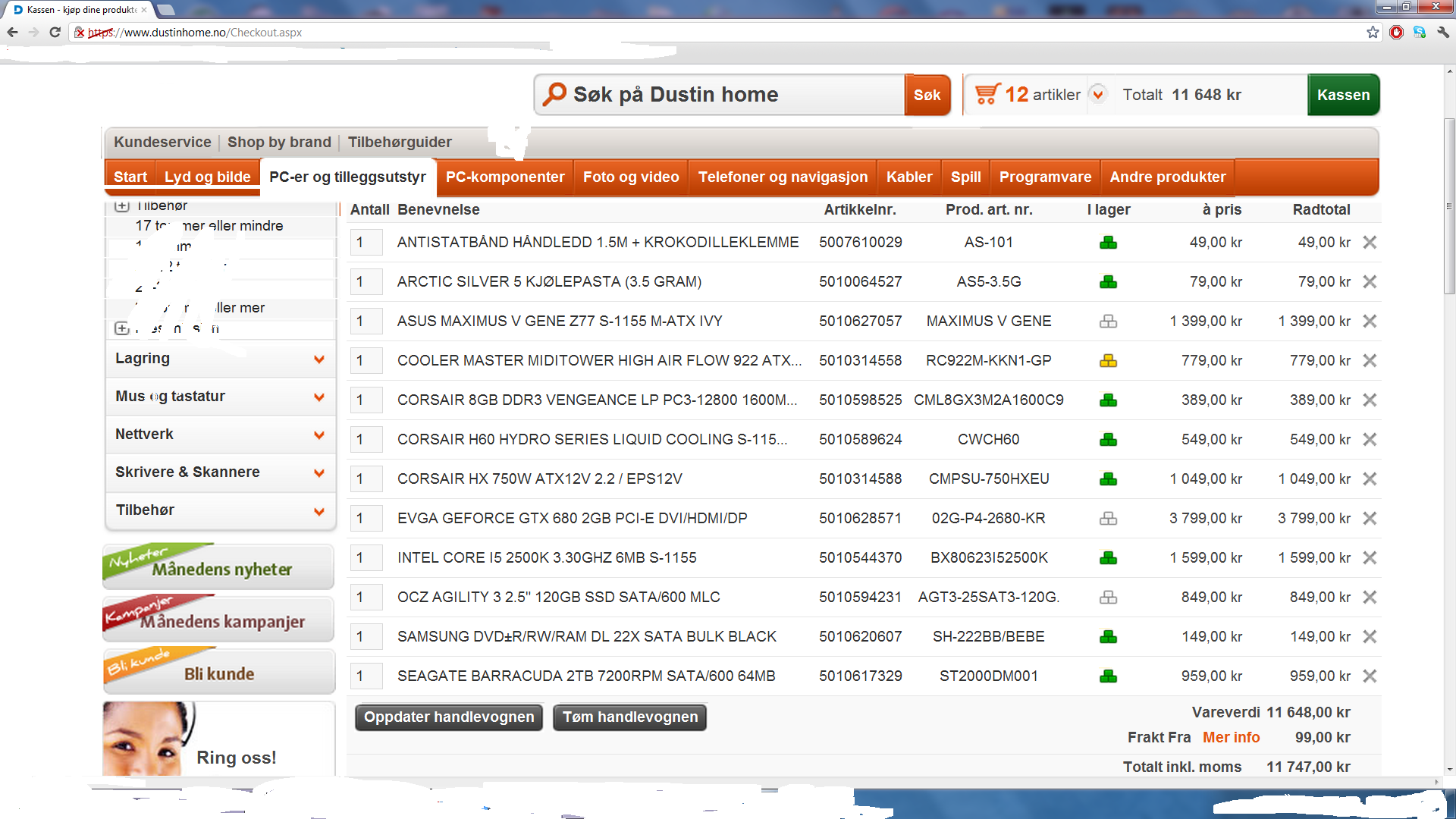 Nja, vil ikke anbefale HAF en plass, men det er det du som bestemmer. Bytt ut SSD'en med en Intel 520 da den er mye mer stabil. Du trenger ikke kjølepasta og slikt armbånd, pasta følger med CPU cooleren og du kan jorde deg lett viss du tror det kommer til å bli ett problem. Anbefaler å bytte PSU'en til en 650W da det er rettere sagt en Seasonic PSU, og ikke en CWT psu, viss du syntes det er lite så velg helst en Seasonic PSU.