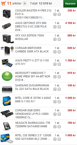 Elvis Plesly Skrevet 8. mai 2012 Skrevet 8. mai 2012 Hallo Her har jeg satt opp ett oppsett til deg; Velg det kabinettet du liker best Om det å bygge PC er spennende, kan jo skrive at dette ble postet litt tidligere i en tråd lignende denne: Tusen takk for hjelp, faen hvor gøy det var å bygge PC! Lurte hvorfor du har valgt Ivy Bridge i5 over Sandy Bridge i5? Er som regel samme stock hastighet, og å overclocke i5 SB er mer kjent = "bedre". Litt dumt å putte de ekstra lappene (ca 800,-) på IB CPU + hovedkort z77 som man må ha for IB.