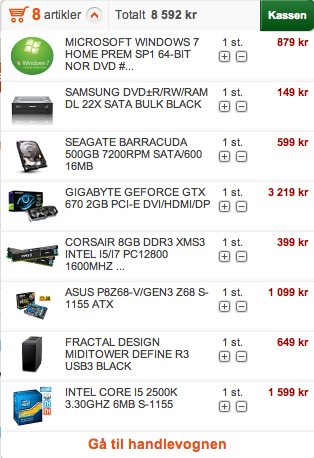 Leikni Skrevet 22. mai 2012 Skrevet 22. mai 2012 Forslag fra Dustin. Jeg har nettop kjøpt samme delene og kunne ikke vert mer fornøyd, eneste er at de rammbrikkene ner ikke bra nok.. ta http://www.dustinhome.no/product/5010543803/corsair-8gb-ddr3-xms3-vengeance-pc3-12800-1600mhz-cl9-2x4gb/#intcmp=searchProvider_dacsa disse