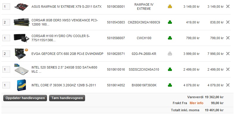 Ekinorak Skrevet 26. mai 2012 Skrevet 26. mai 2012 (endret) Da var det på tide å oppgradere pcen. Jeg bruker stort sett pcen til spilling i 2560x1600 eller benchmarking og overklokking. Er det noe jeg burde forbedre på dette oppsettet? Lurer også på om en kan installere Windows 7 på et ssd raid, da vurderer jeg muligens 2x av den intel ssden. I tillegg har jeg allerede, Obsidian 800D og Thoughpower 1200Watt psu, bluray drive, og harddisker. Endret 26. mai 2012 av Ekinorak