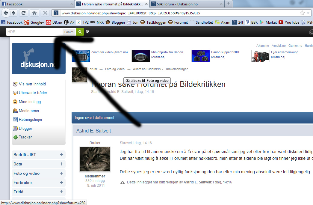 awesnes Skrevet 8. juni 2012 Skrevet 8. juni 2012 (endret) Hvilken skin/utseende bruker du på forumet? På "diskusjon dynamisk" har du jo en søkeboks helt øverst på siden. Trykker du på det grå feltet til høyre for søkeboksen så kan du forandre om du vil søke i tråden, hele forumet og noen alternativer til. Evt kan du bruke denne adressen her: https://www.diskusjon.no/sok/ Trykker du "vis flere alternativer" kan du spesifisere hvilket kategori du skal søke i. Endret 8. juni 2012 av awesnes 2