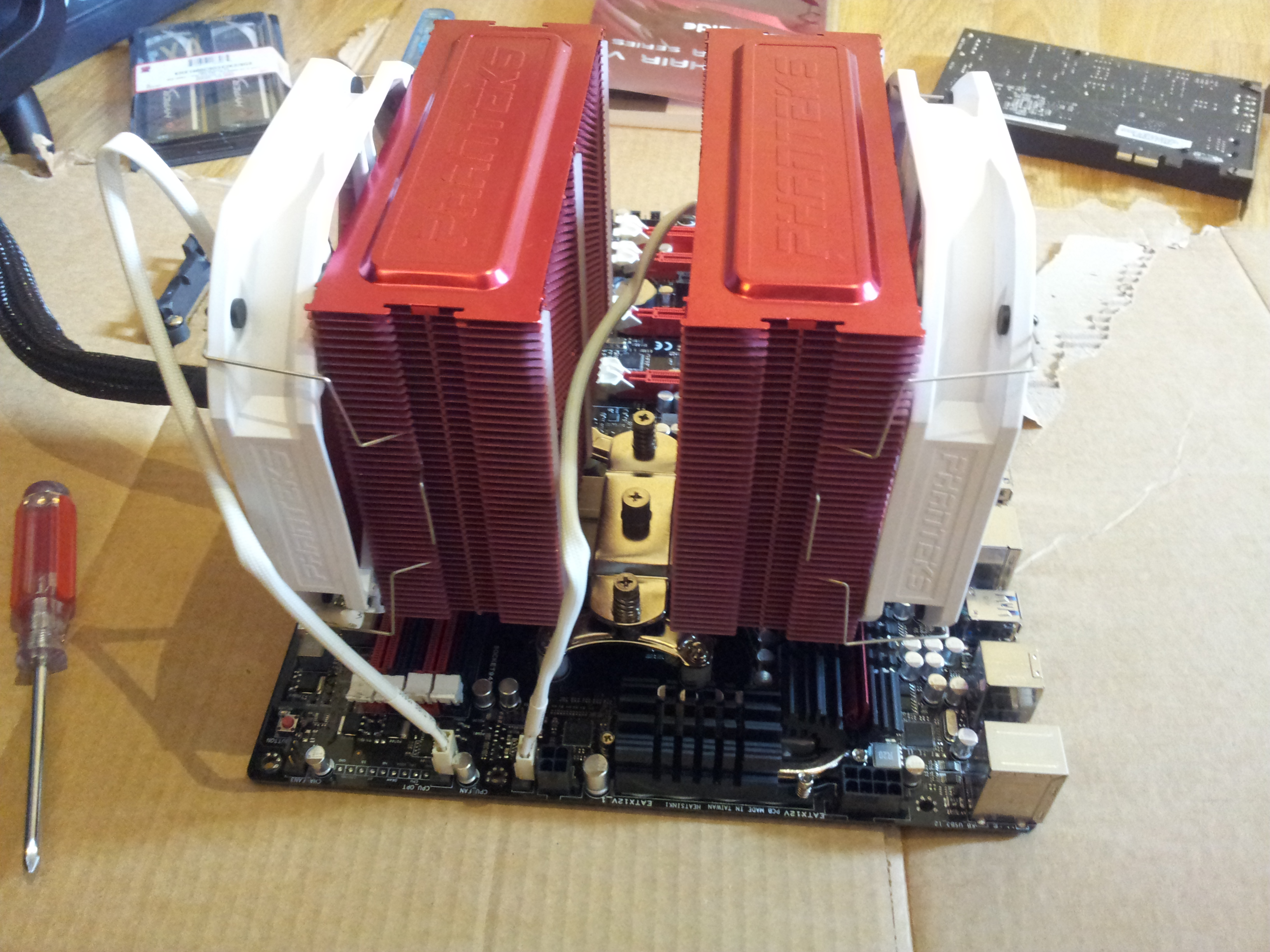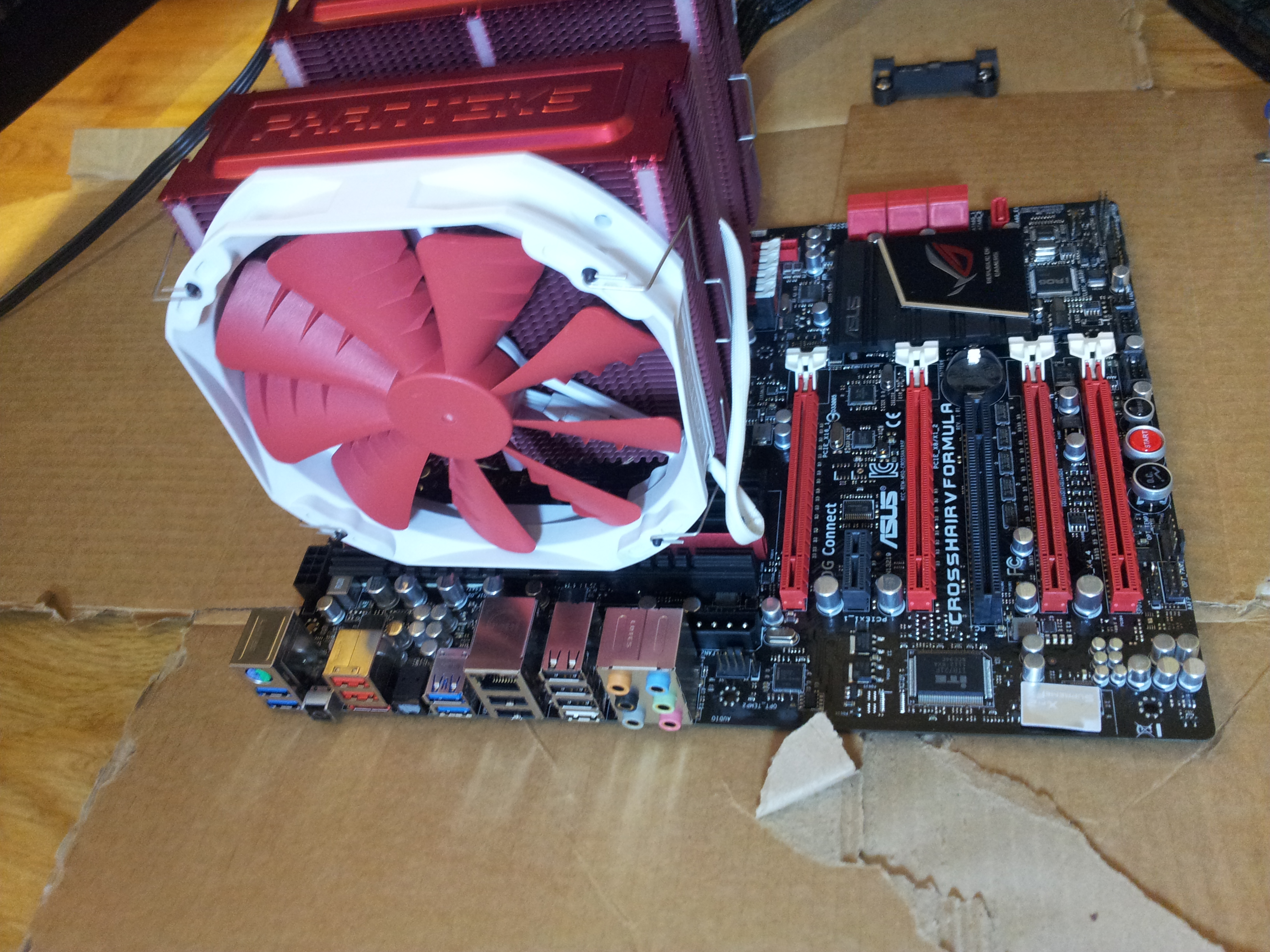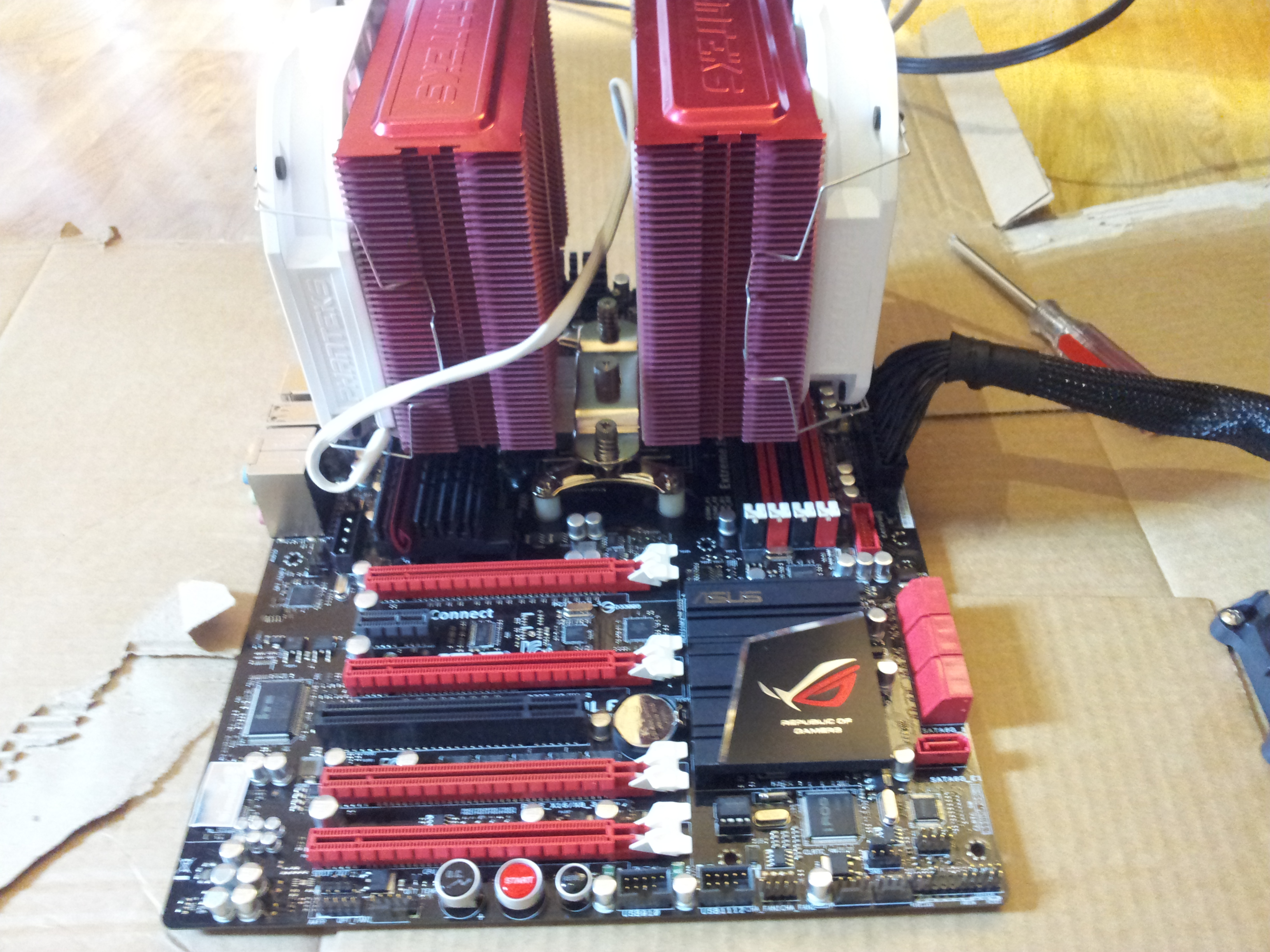 Bjornizz Skrevet 15. juni 2012 Skrevet 15. juni 2012 (endret) Hei. Feilsøker nå min nye pc etter dustinhome sitt skjema. I skjemaet står at jeg skal koble til strøm, prosessor og prosessorkjøler og muligens noen høytalere visst ikke hovedkortet har integrert lyd. Derretter skal jeg kortslutte de to pinnene som det står pwr switch på og det skal komme feil melding i form av lyd/piping. Kommer ikke noe feilkode for meg uannsett hva jeg gjør. Har lagt ved noen bilder av oppsettet slik det er nå. Det er en liten ledpære som heter DRAM Led som blinker rødt visst jeg trykker på knappen Go Button. Har også prøvd å starte maskinen med Start knappen på hovedkortet. Jeg koblet også på skjermkortet, men det kommer ingen signal på skjermen og fortsatt ingen feilmeldinger. Jeg prøvde også å koble til rammen, men fortsatt ingen ting. Komponenter: - Hovedkort: ASUS Crosshair V Formula/Thunderbolt - CPU: AMD FX-8150 8 kjernet - CPU-kjøler: Phanteks PH-TC-14PE - RAM: 16Gb DDR3 - Kingston HyperX 4Gb x 4 - Skjermkort: Zotac GeForce GTX 680 4Gb - PSU: Corsair AX1200Watt Komponenter som ikke var tilkoplet: - HDD: Seagate Barracuda 7200.12 1TB - SSD: Kingston HyperX 120Gb - Kabinett: Cooler Master Cosmos 2 Ultra Tower Bjørn Olav Vadder Endret 15. juni 2012 av Bjornizz
